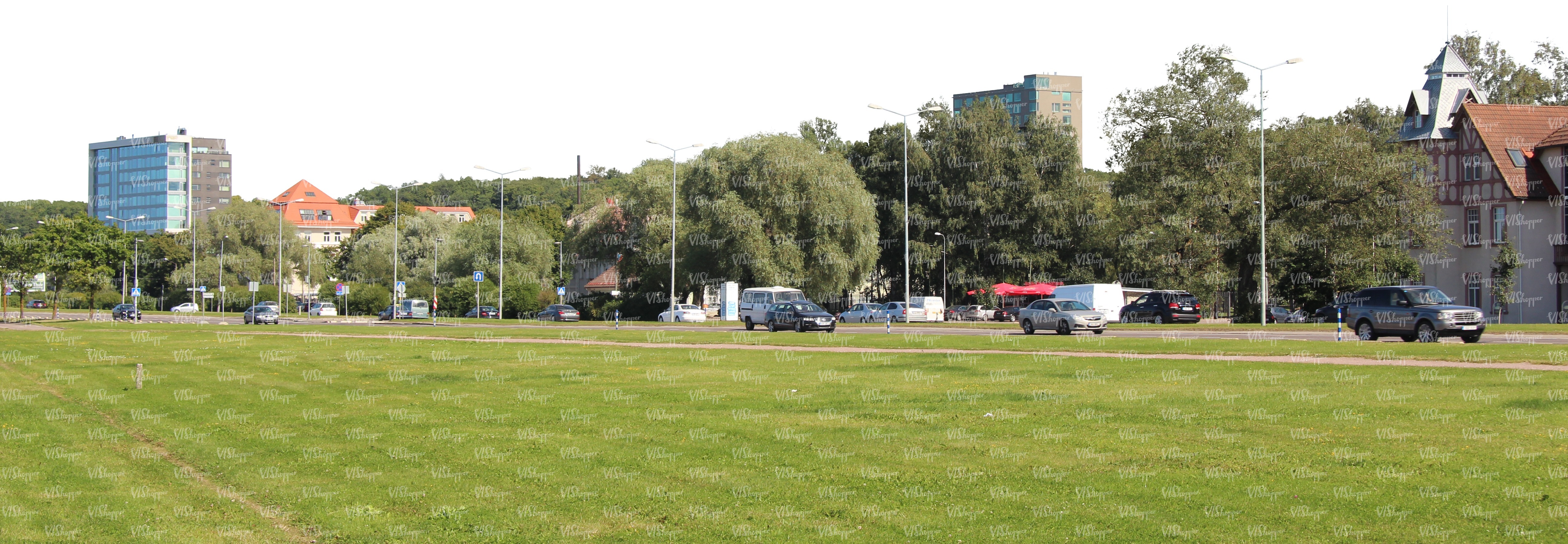 • lawn with a street and hoyses in the background