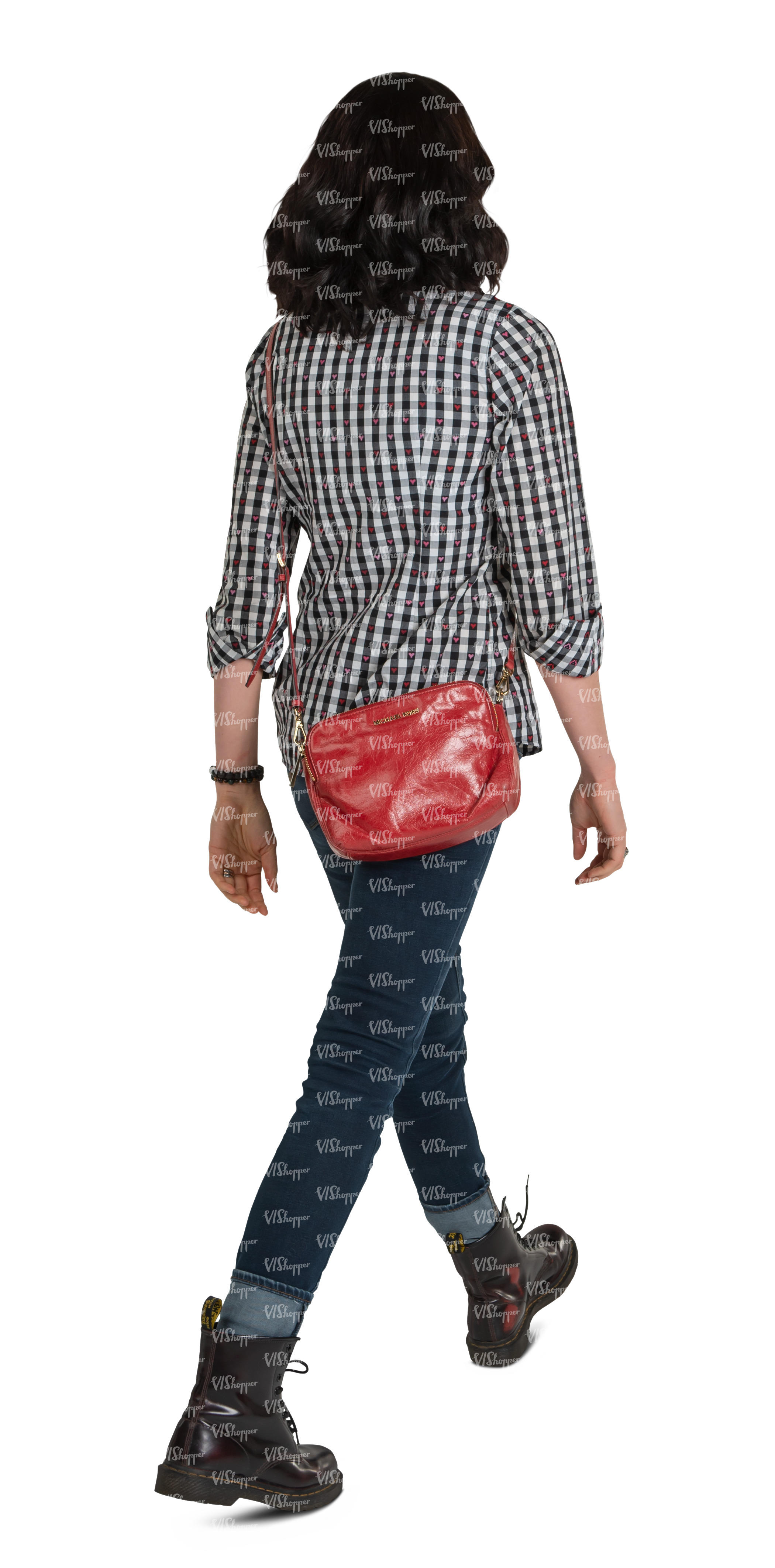 woman in a plaid shirt walking
