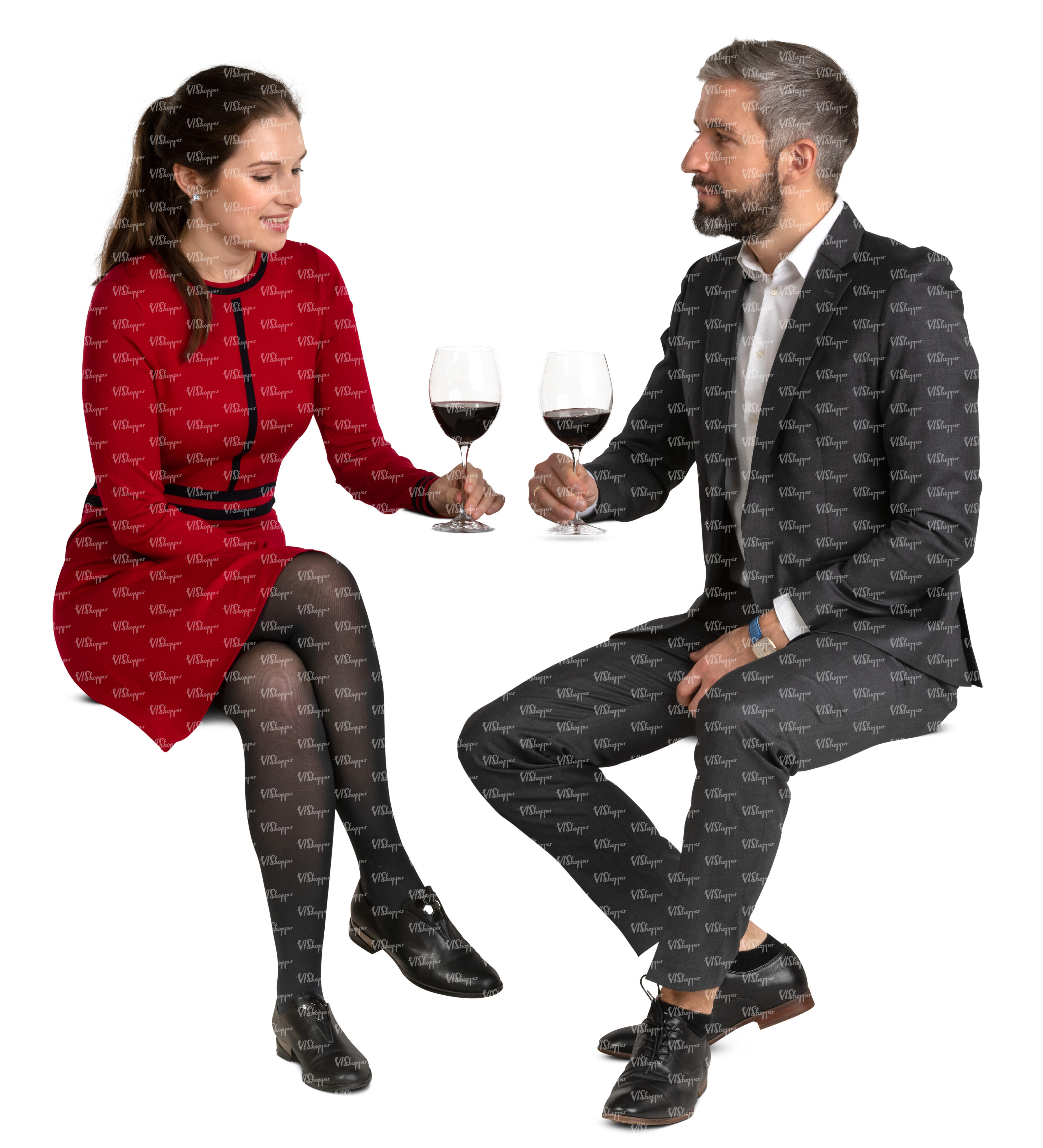 • cut out man and woman standing and talking while drinking refreshing drinks