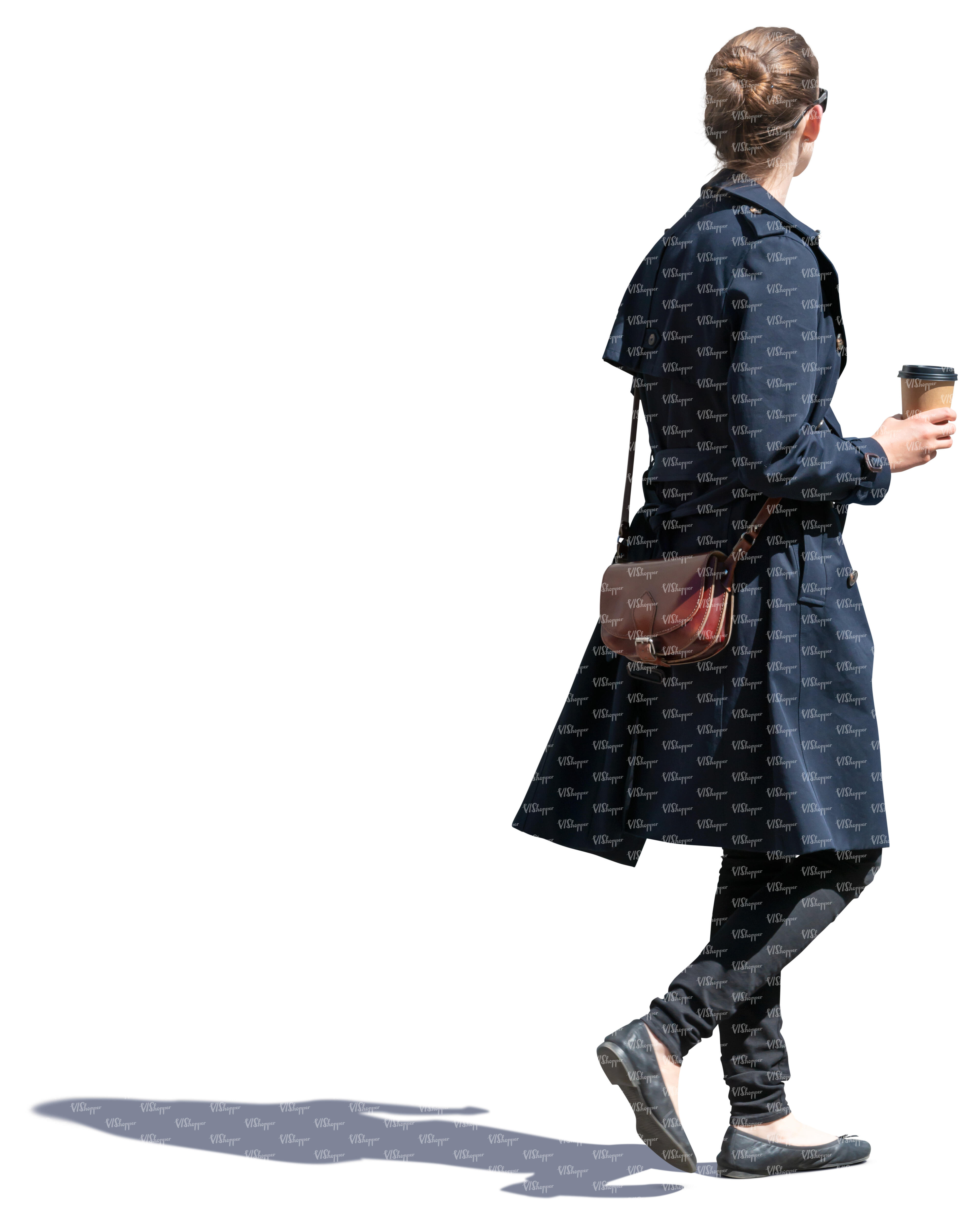 • woman in a blue overcoat drinking coffee on the go