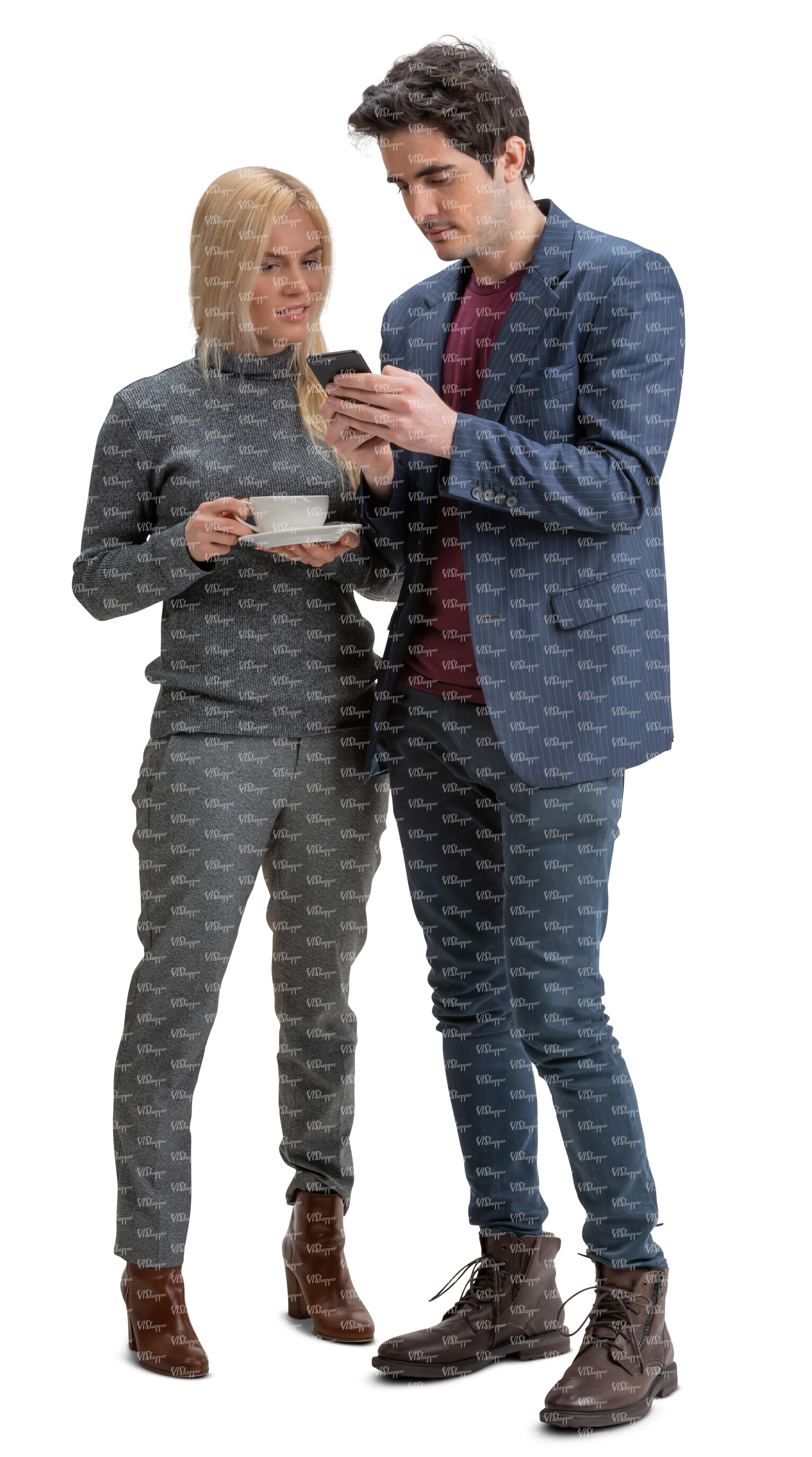 • man and woman standing and looking smth from a phone