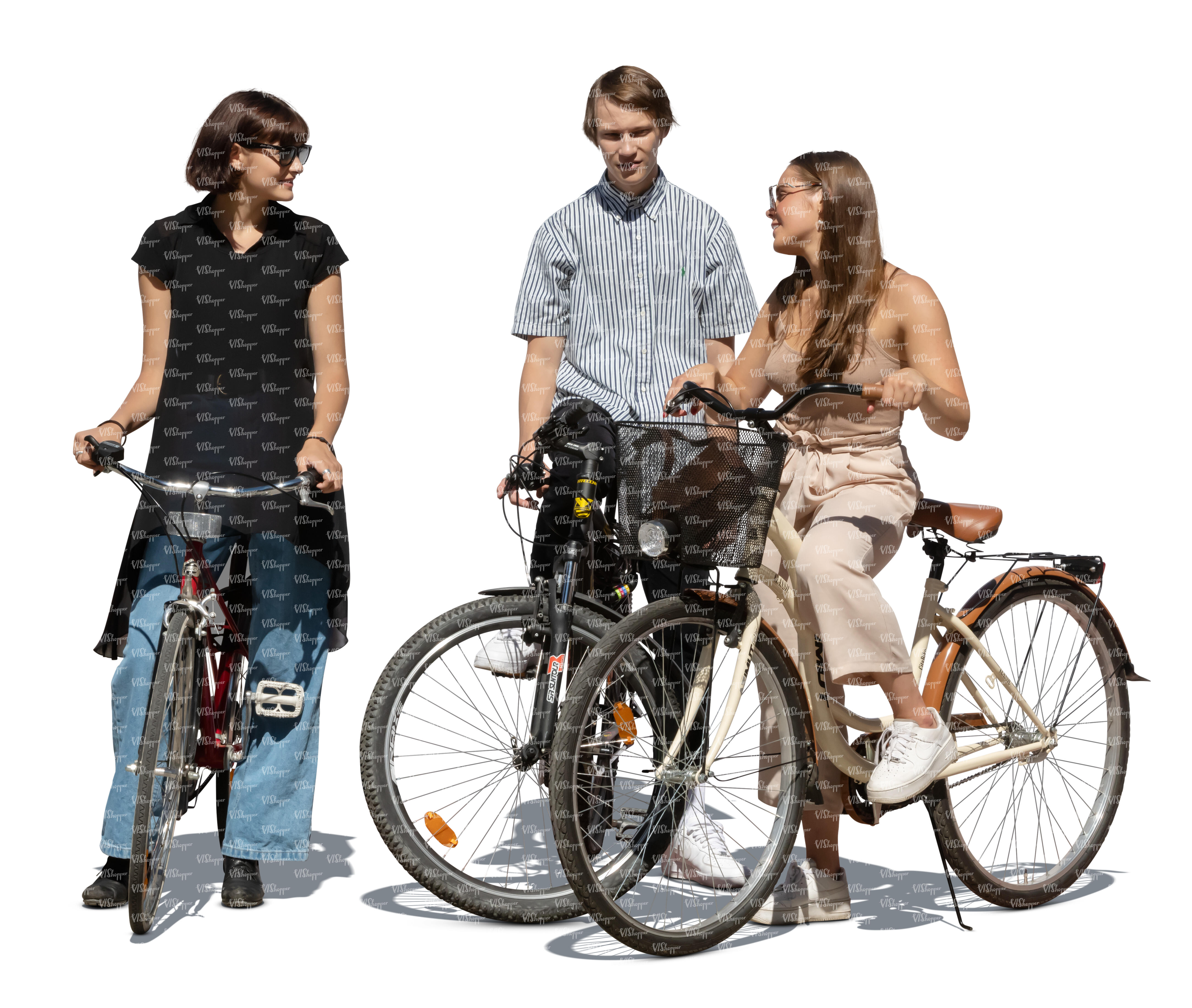 cut out three young people with bicycles standing and talking