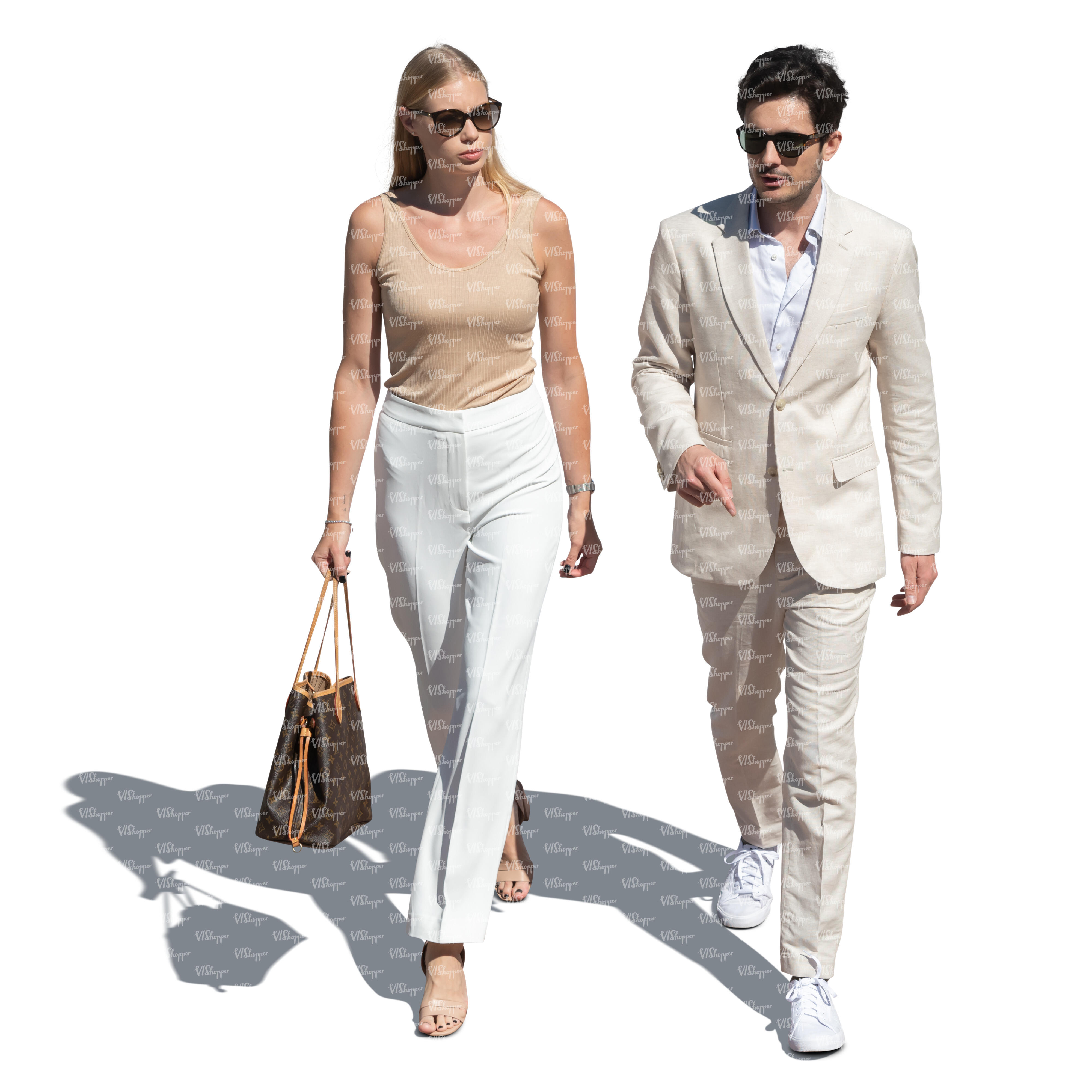 • cut out man and woman in light coloured summer outfits walking seen from above