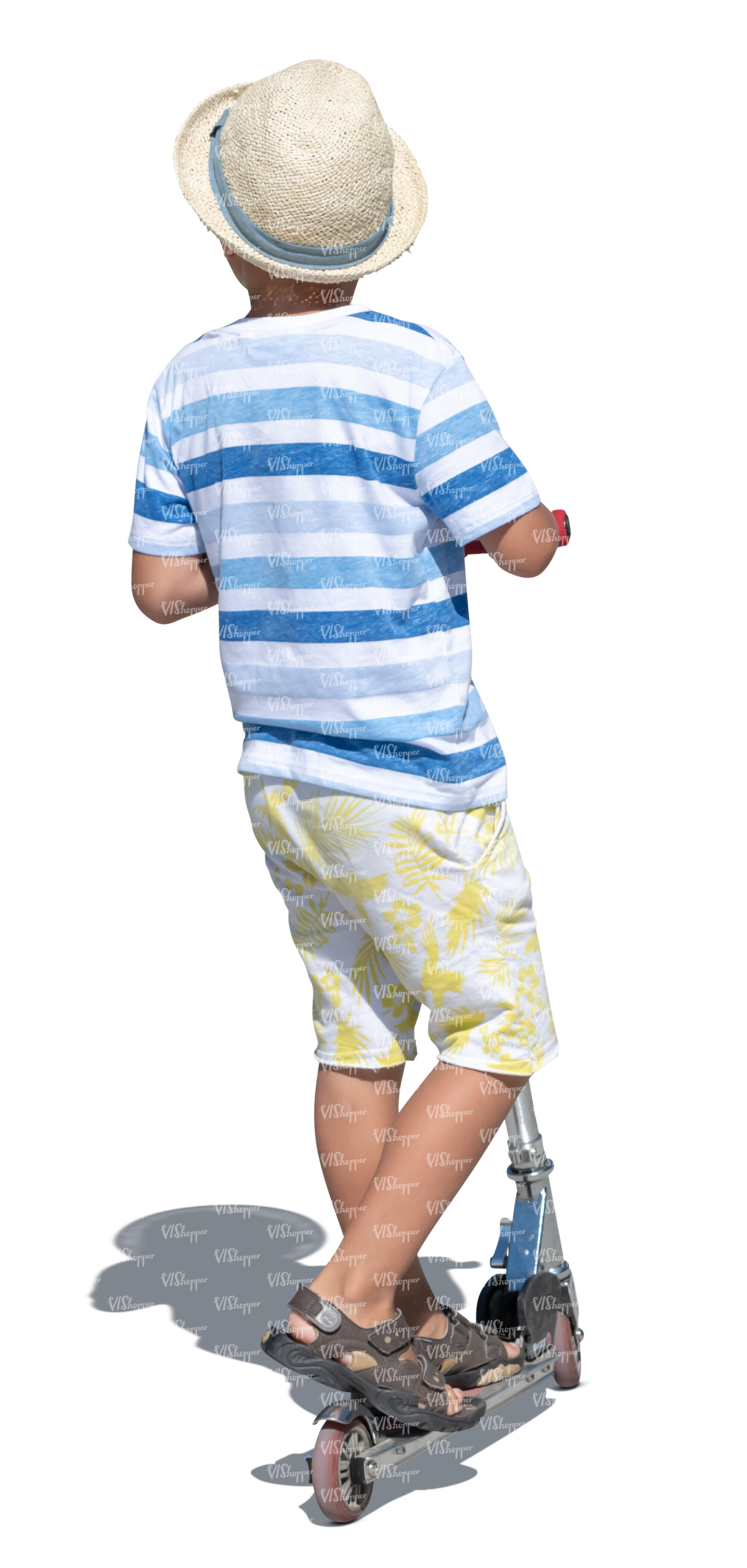 cut out little boy riding a scooter on a summer day