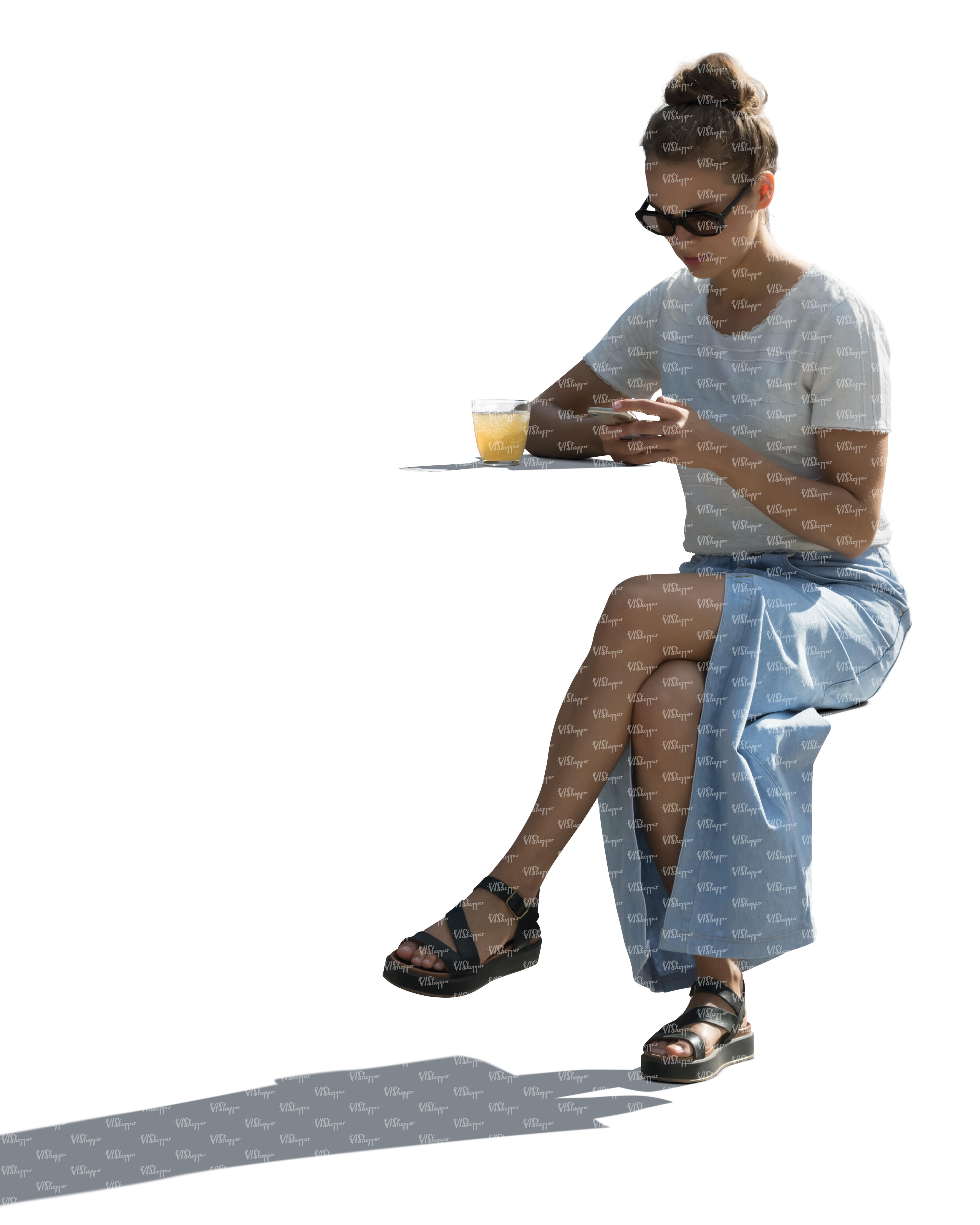 cut out backlit woman with a phone in her hand sitting in a cafe