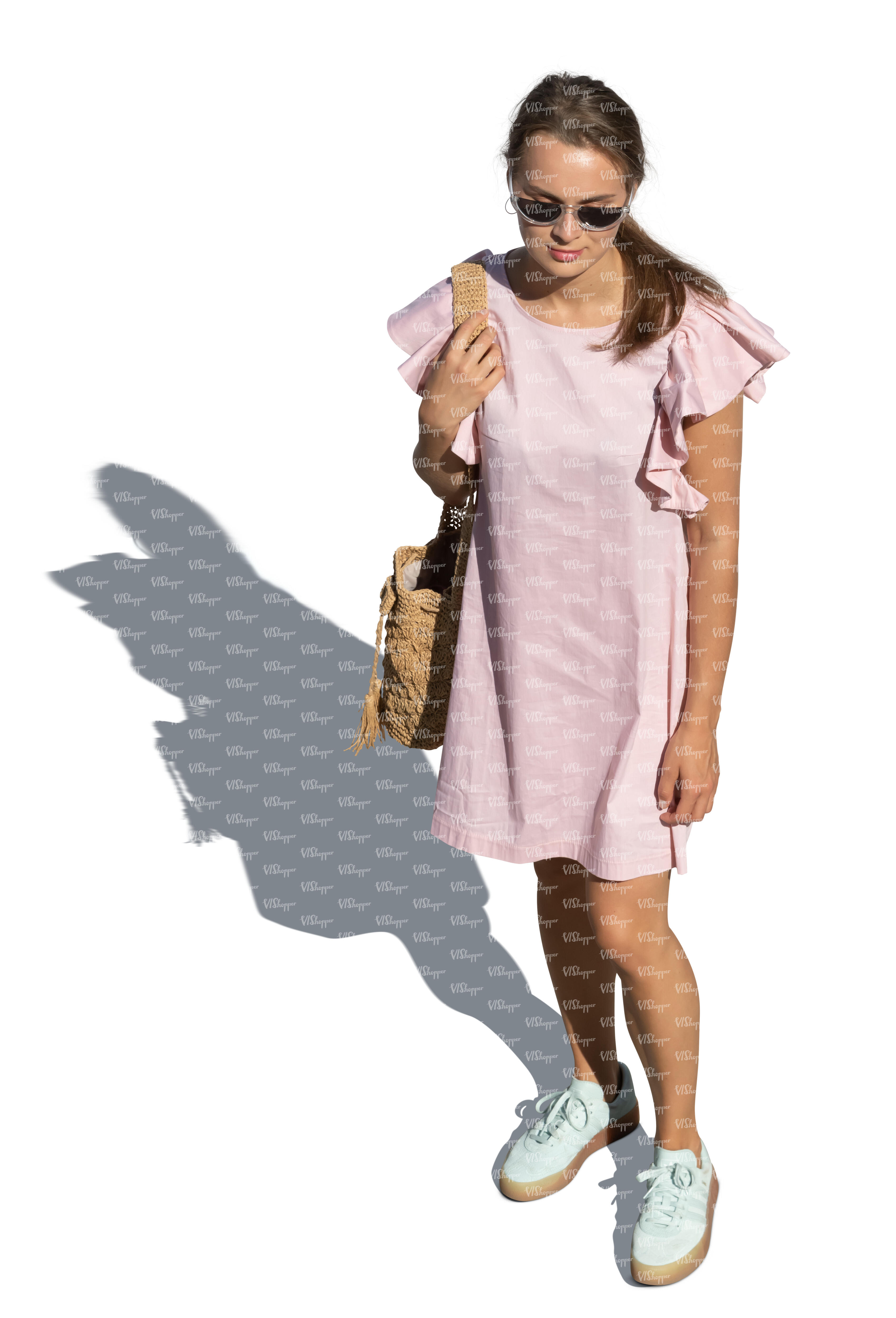 cut out woman in a pink summer dress standing seen from above