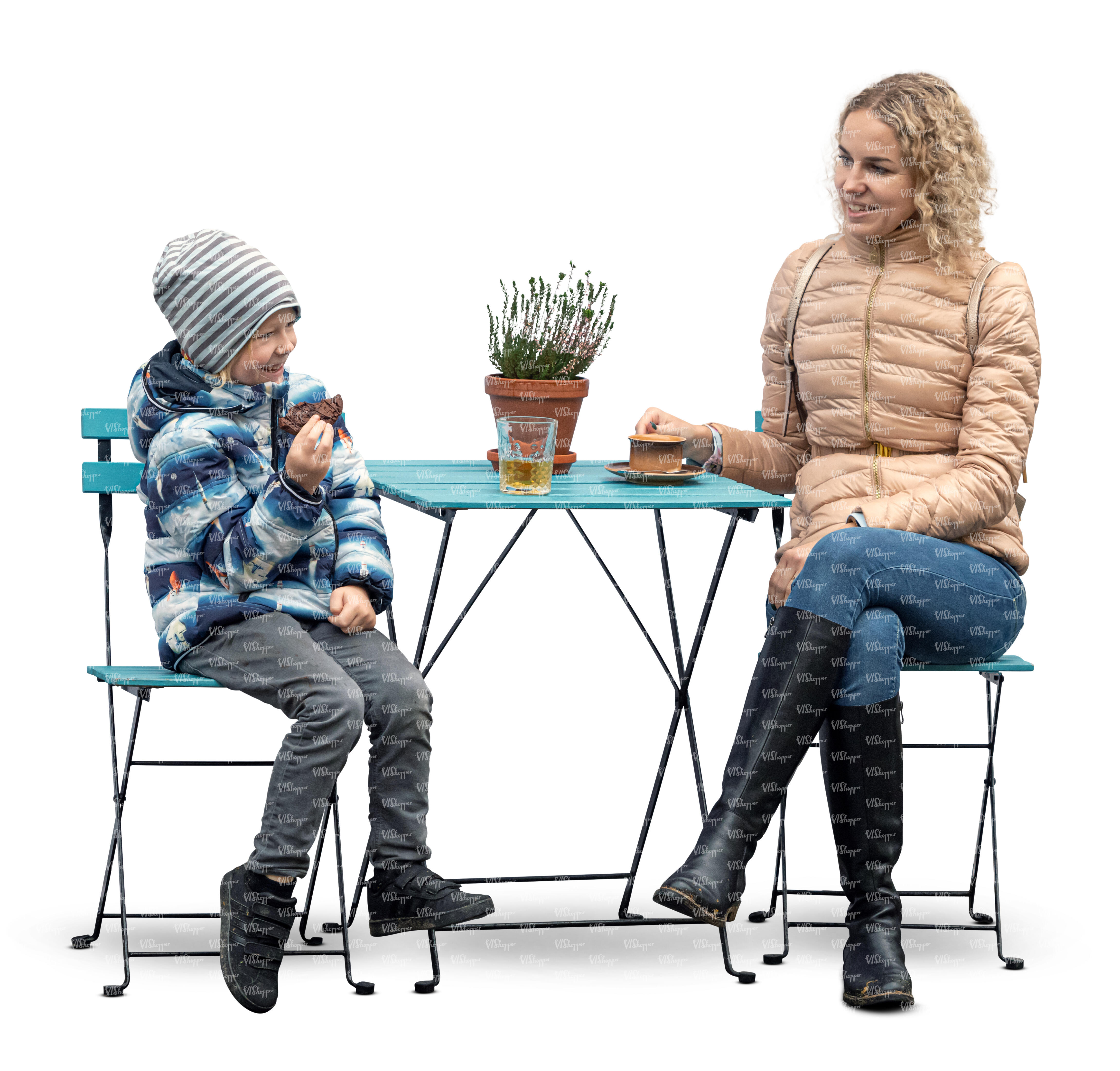 cut out mother and son sitting in a street cafe in a nice autumn weather