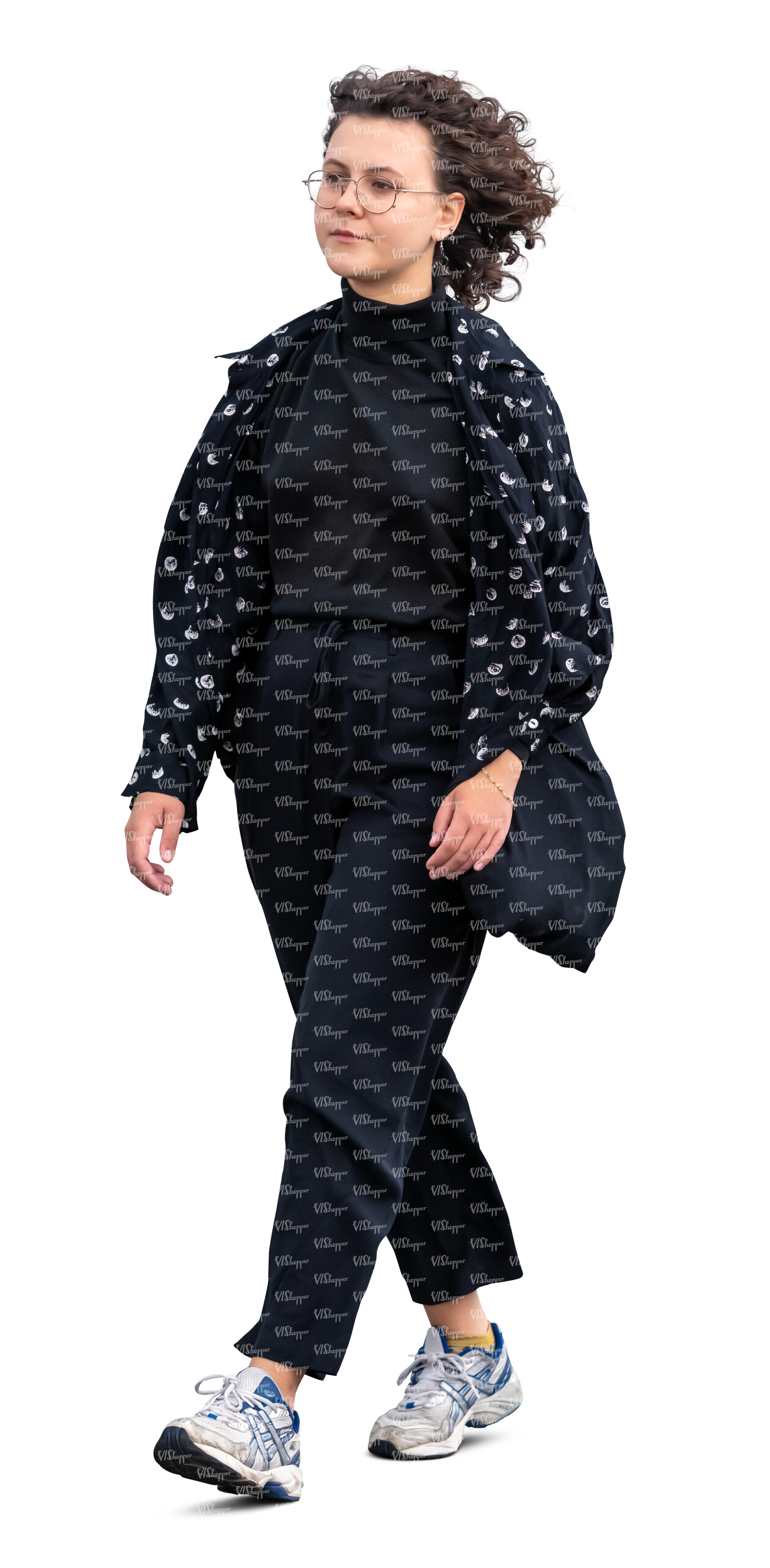 cut out young woman with curly hair walking