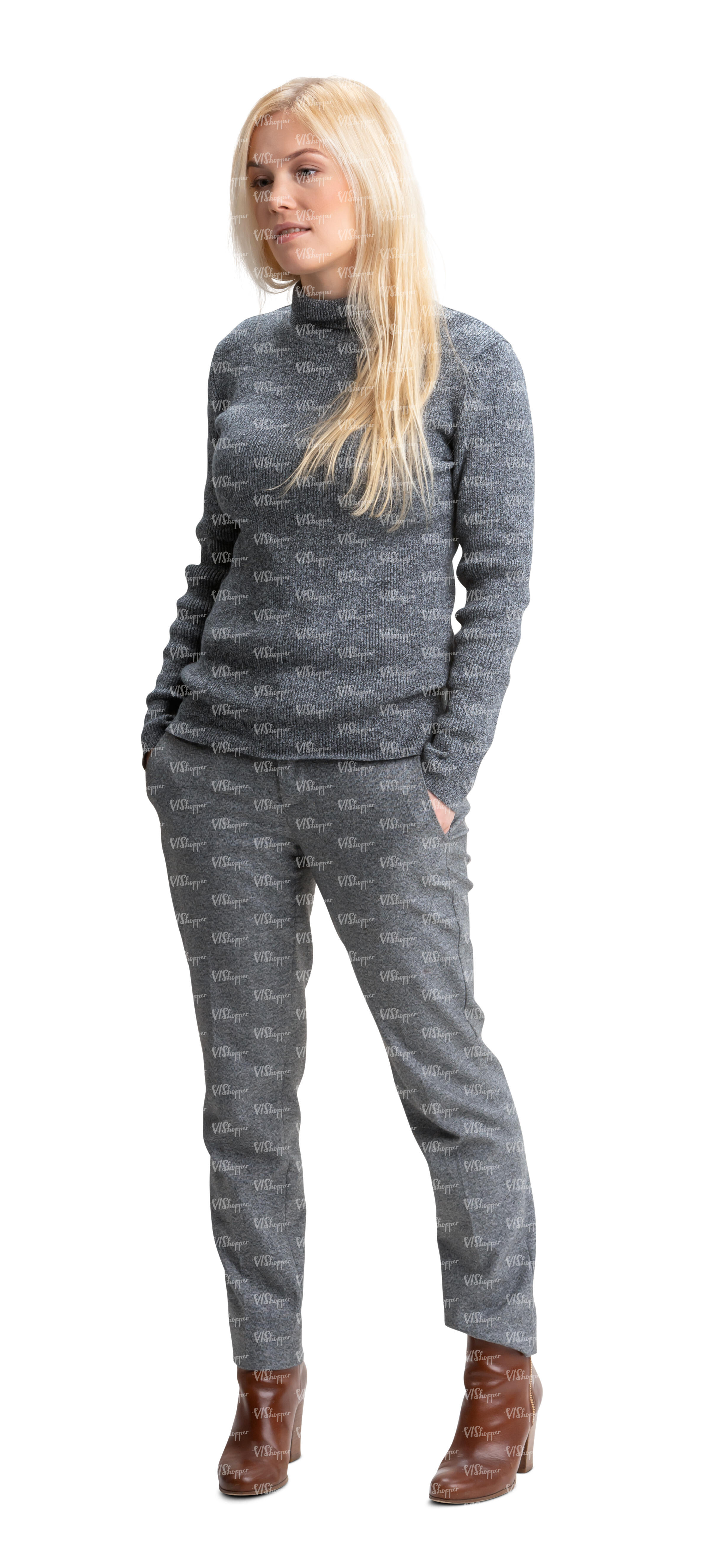 cut out young woman in a grey outfit standing