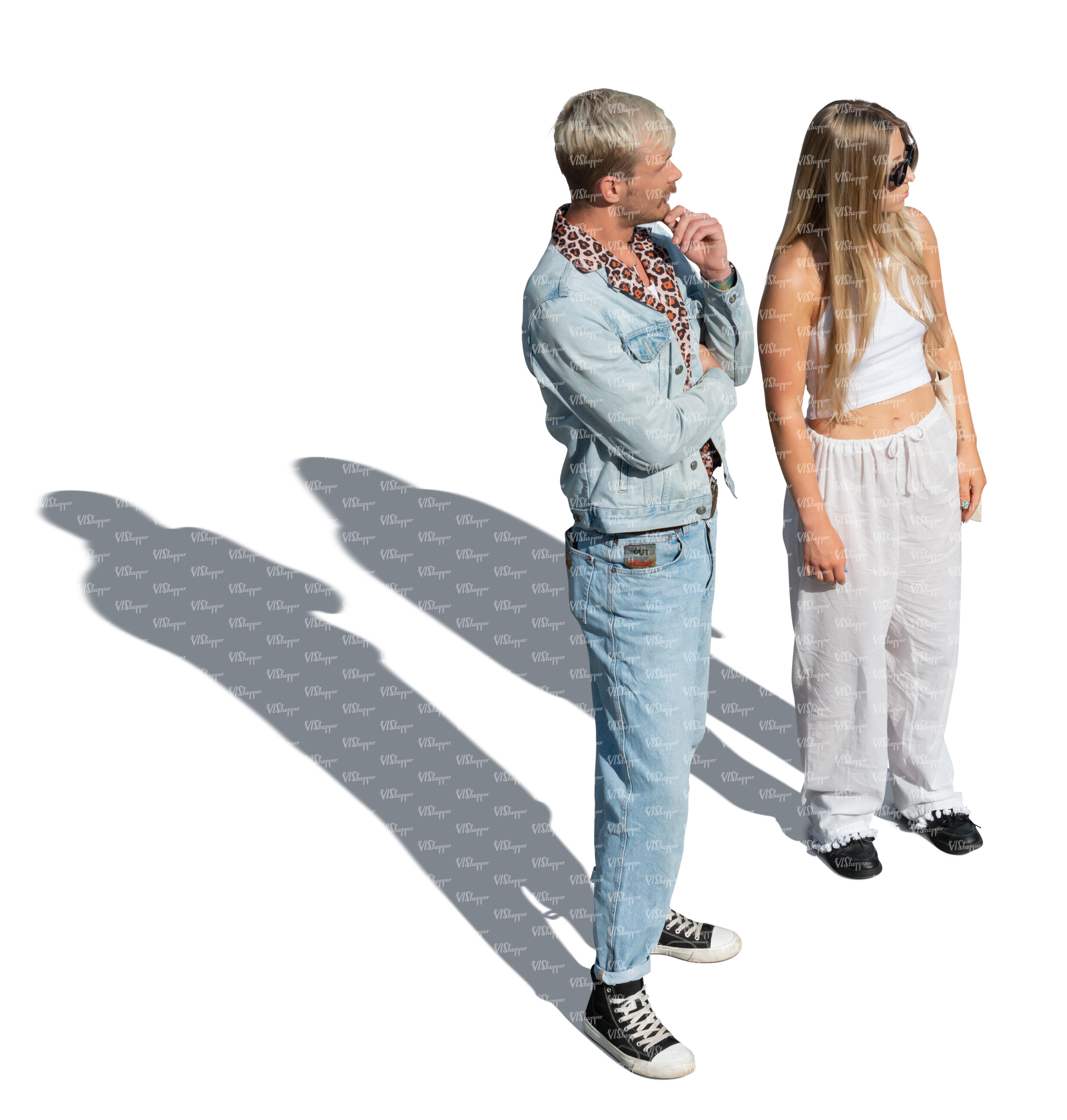 • two cut out people standing and looking in one direction seen from above