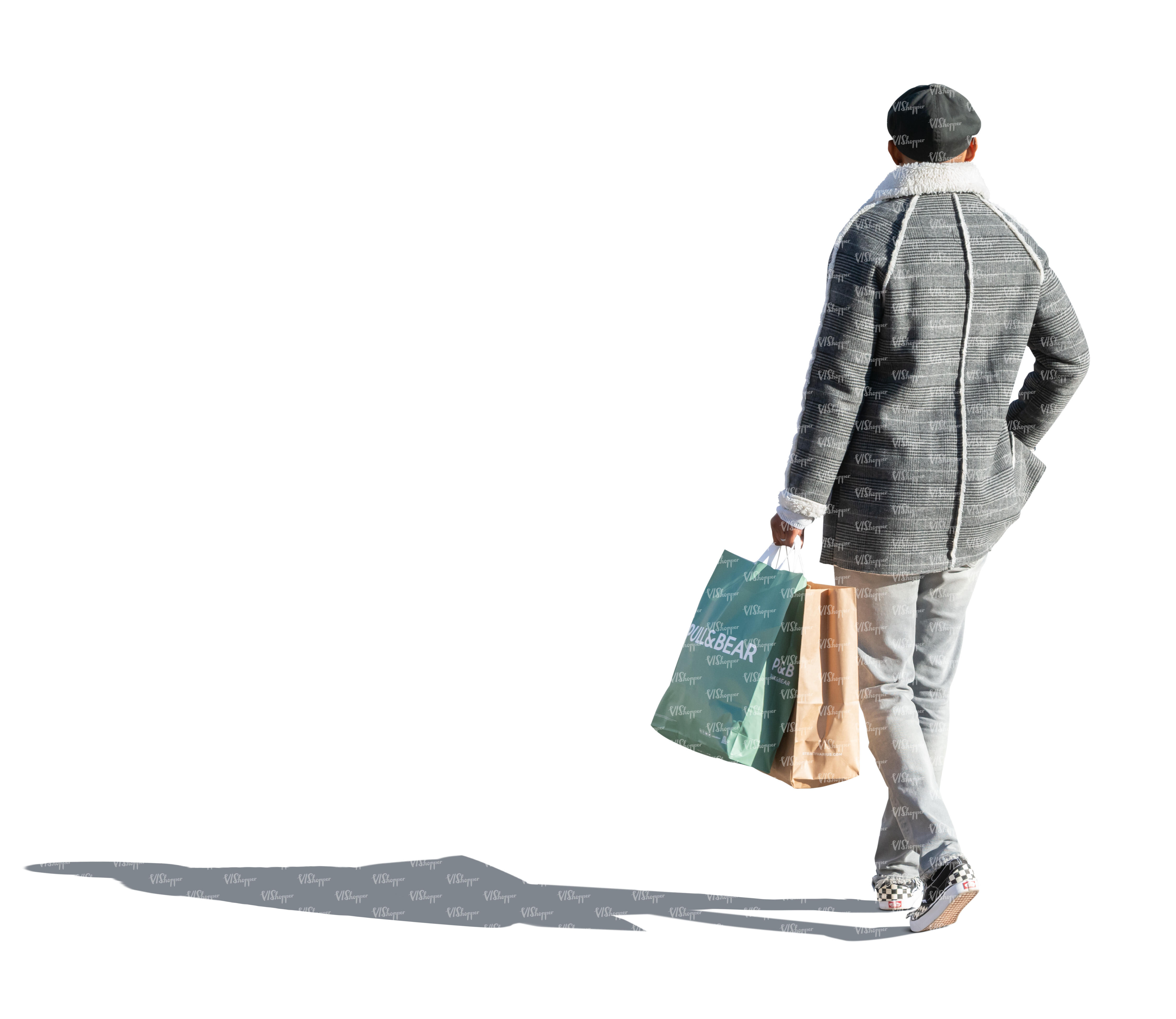 • cut out man in a grey overcoat and carrying shopping bags walking