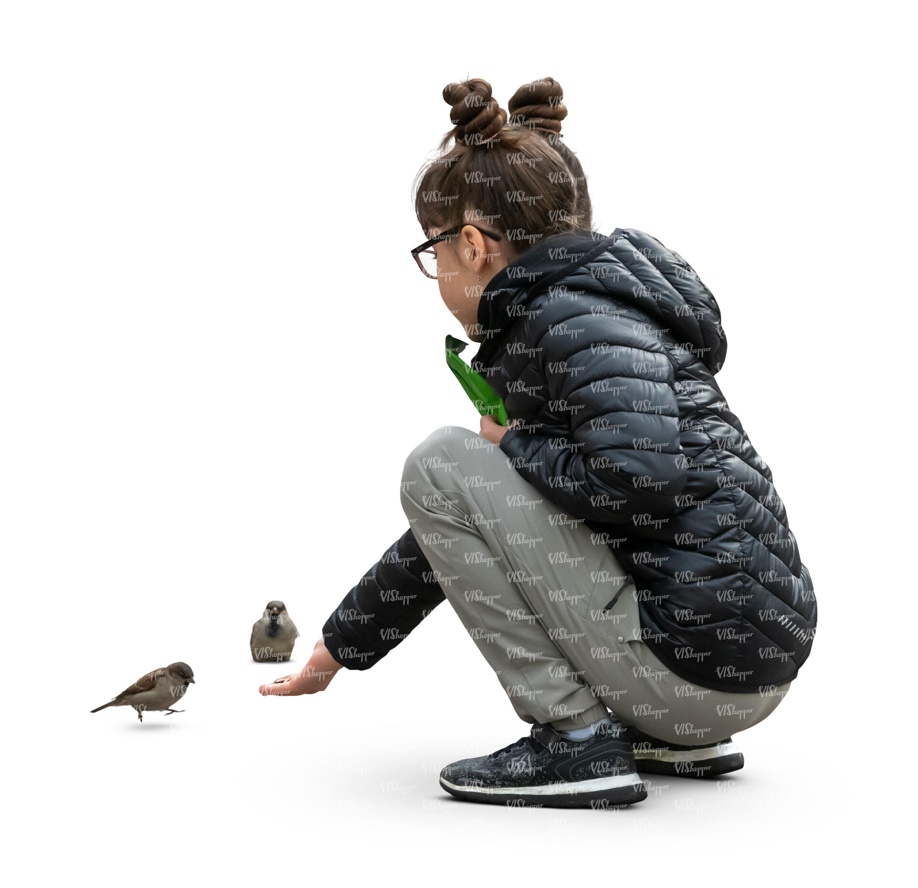 • cut out girl squatting and feeding pigeons