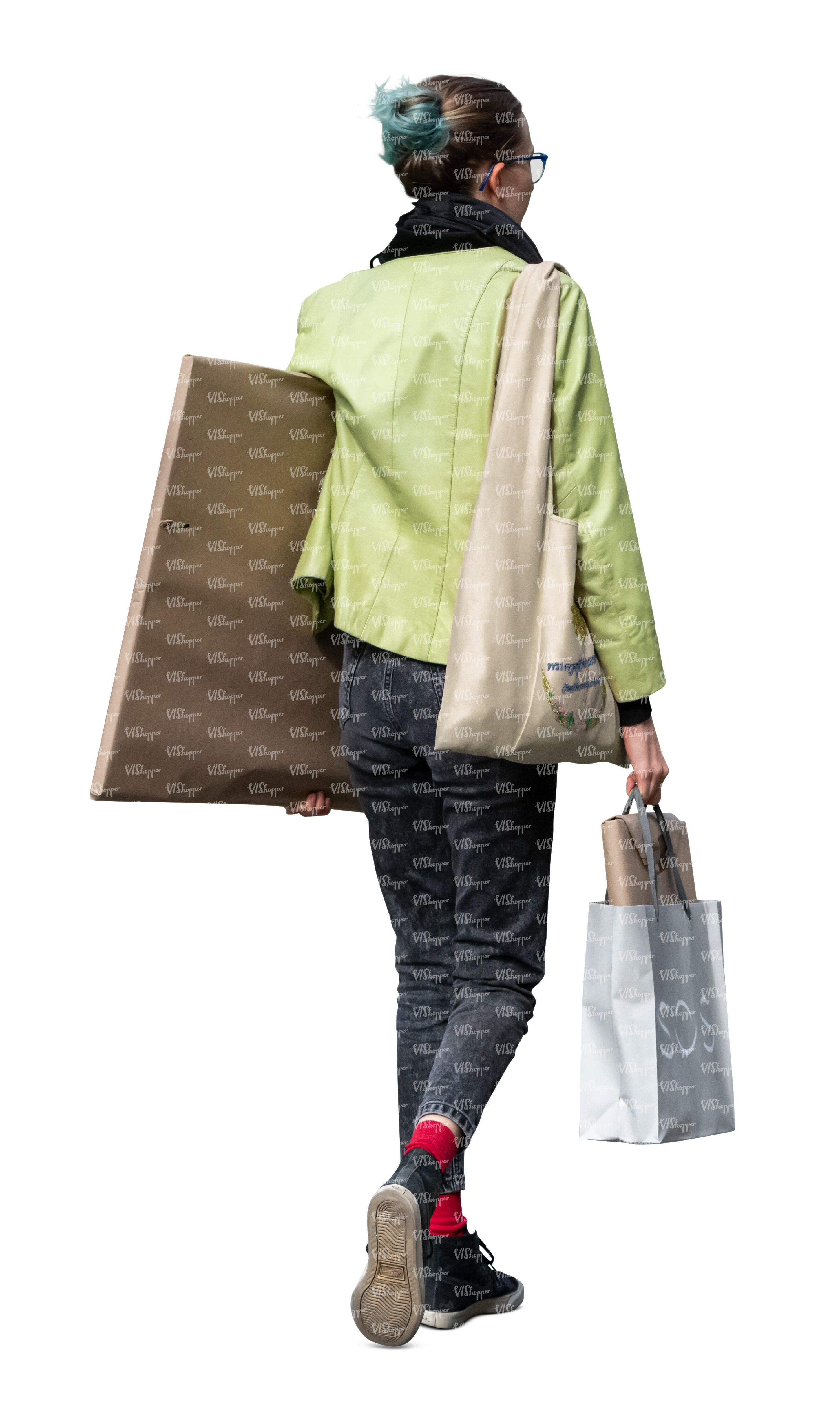 • cut out woman carrying a large package under her arm walking