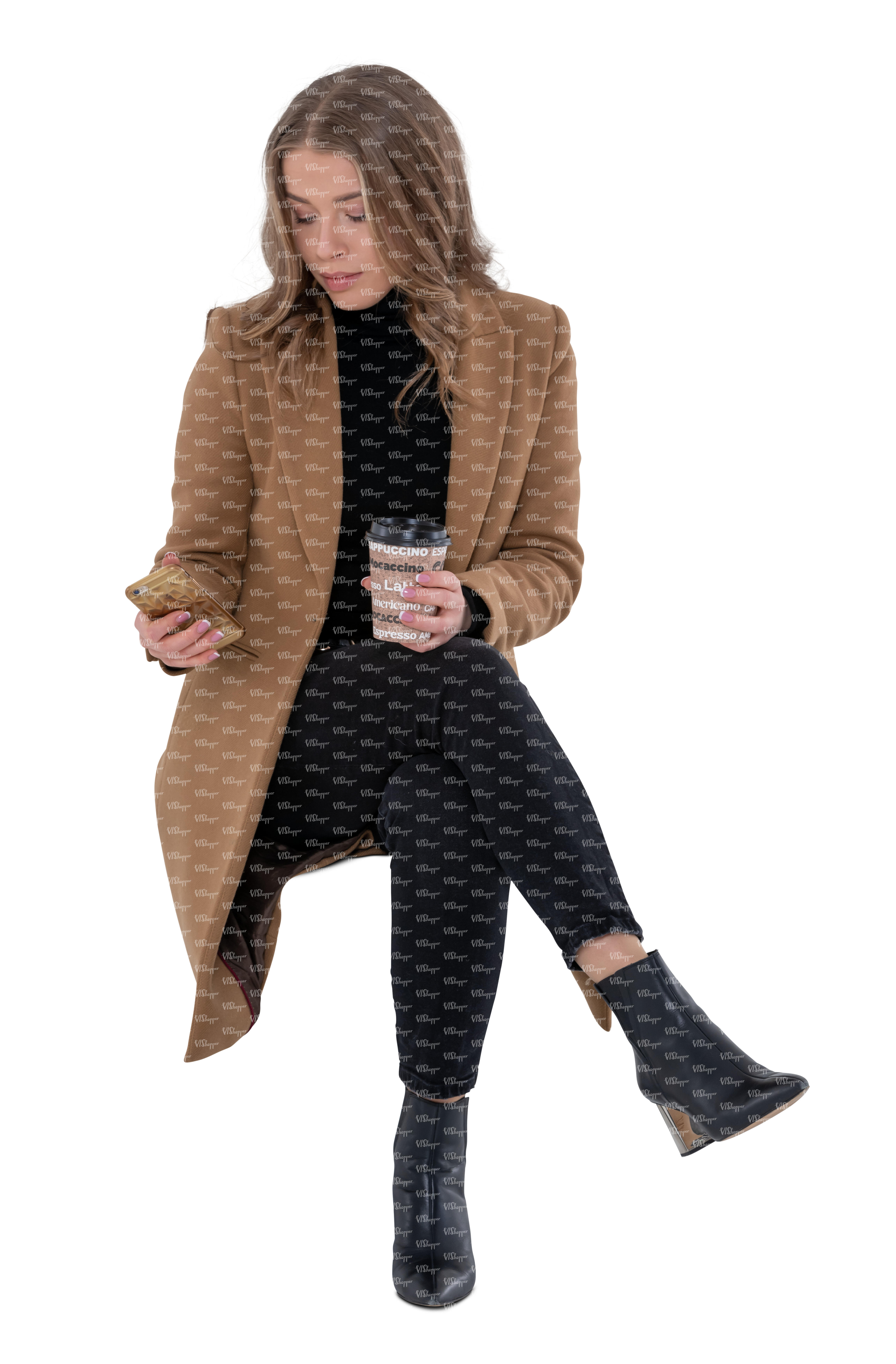 cut out woman in a brown overcoat sitting and drinking coffee