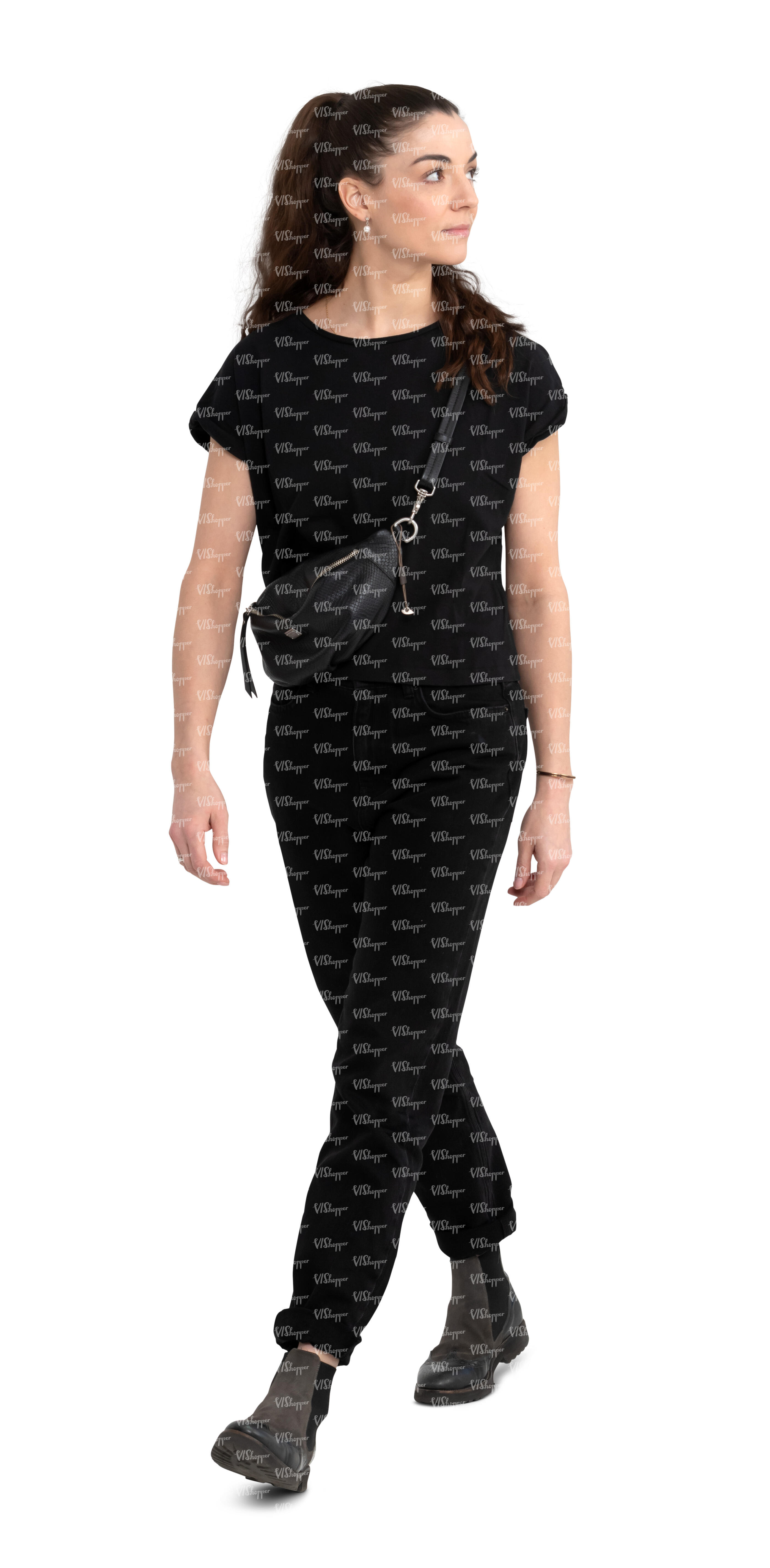 cut out woman in black outfit walking