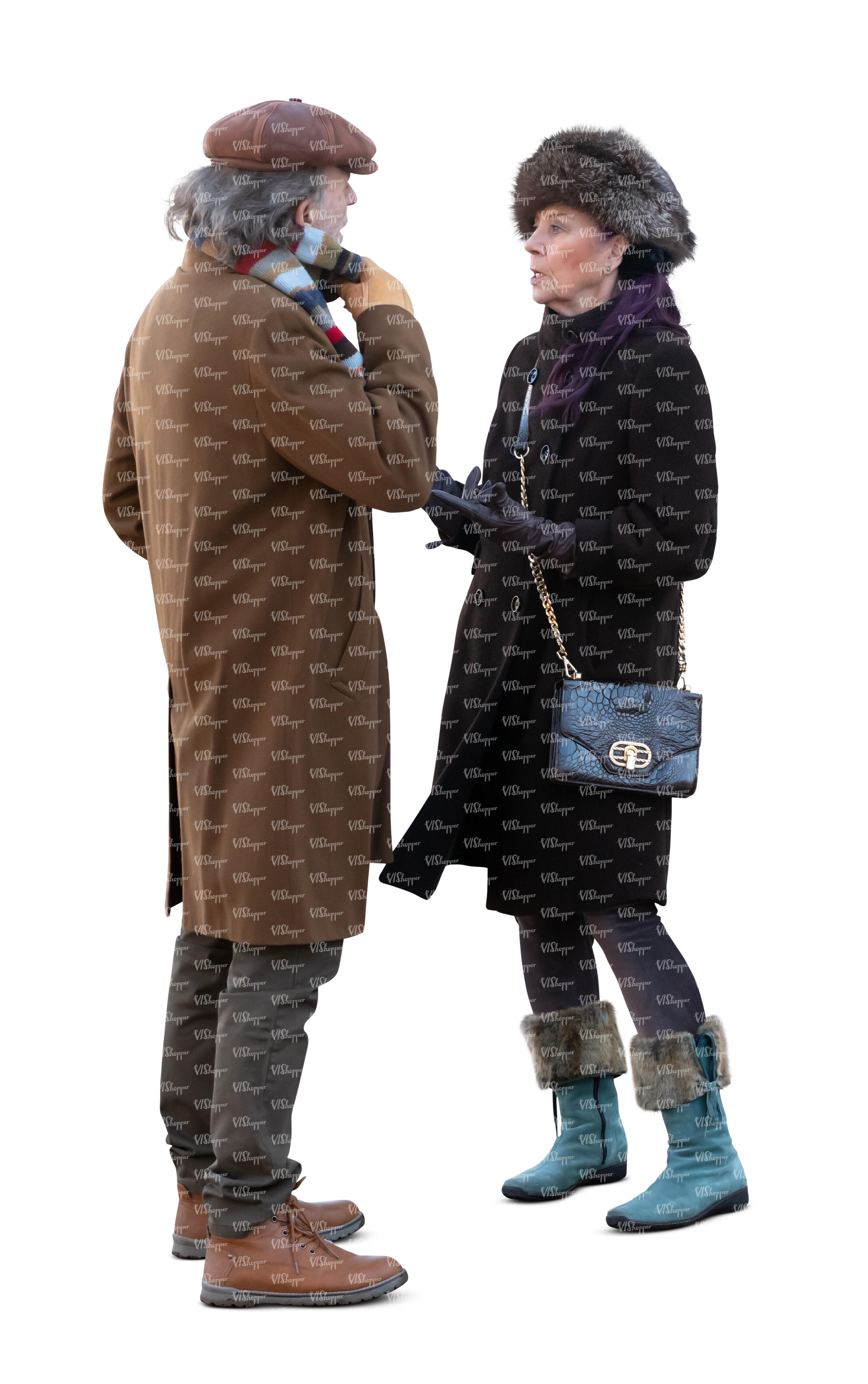 • cut out elderly man and woman standing and talking in winter