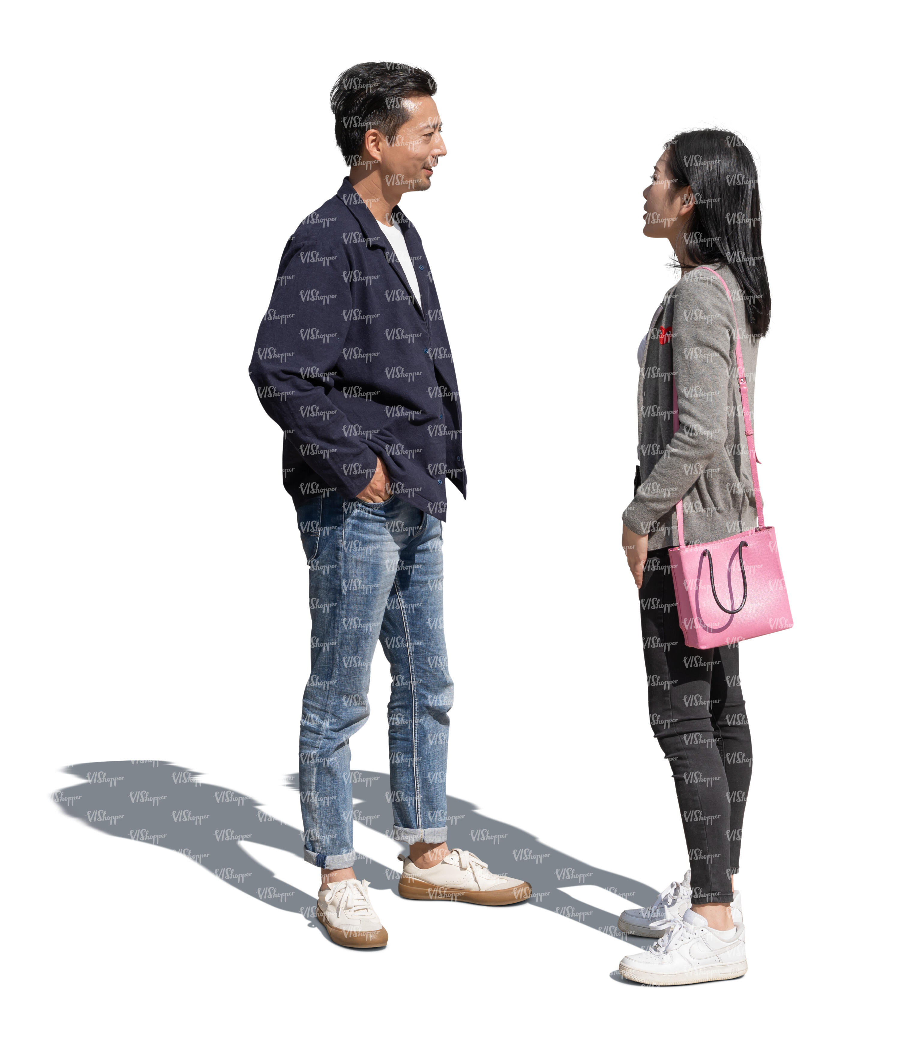 • cut out man and woman standing and talking while drinking refreshing drinks