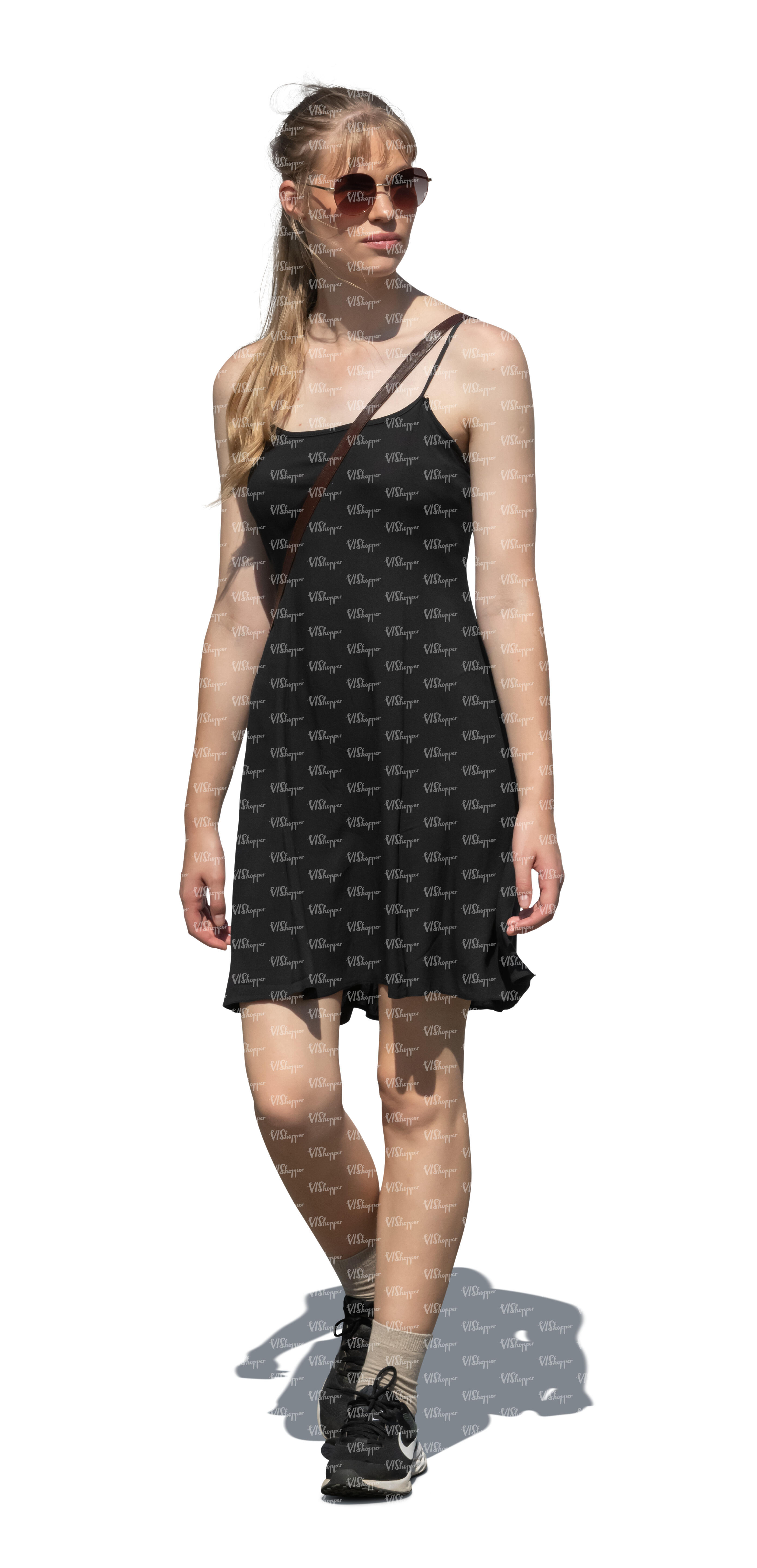 cut out woman in a black summer dress walking