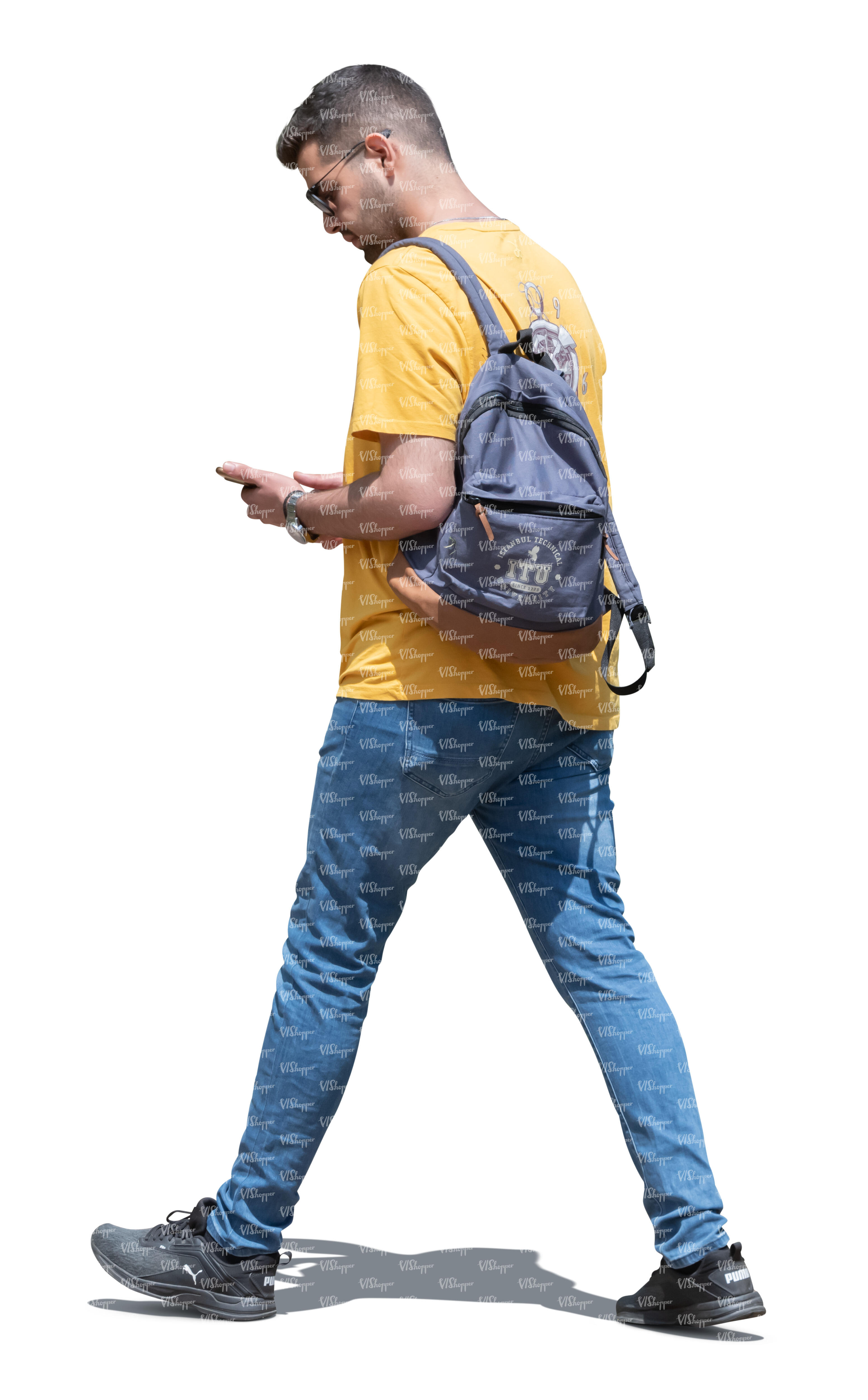 • cut out man walking and checking his phone