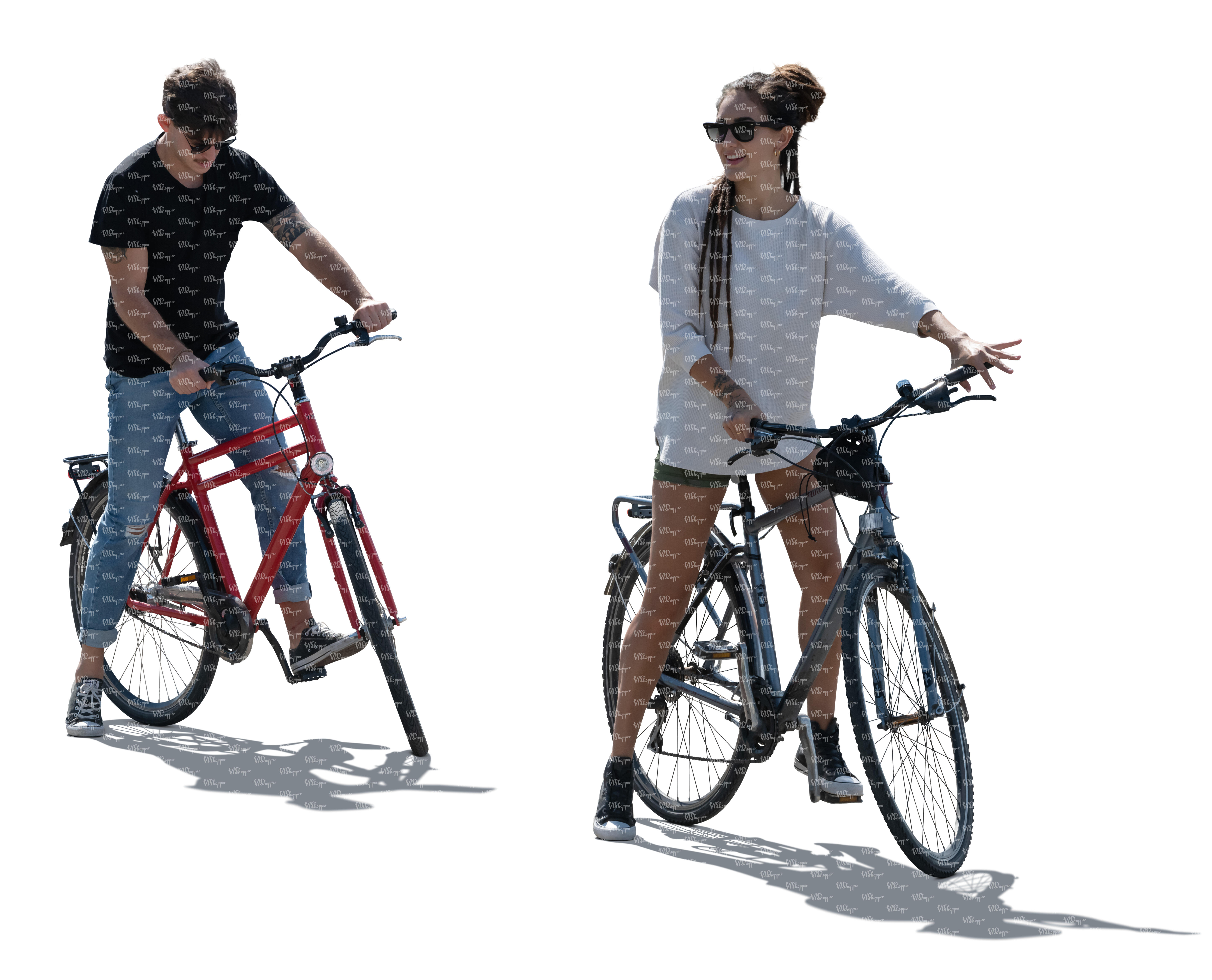 • cut out backlit man and woman on bikes stopping to talk