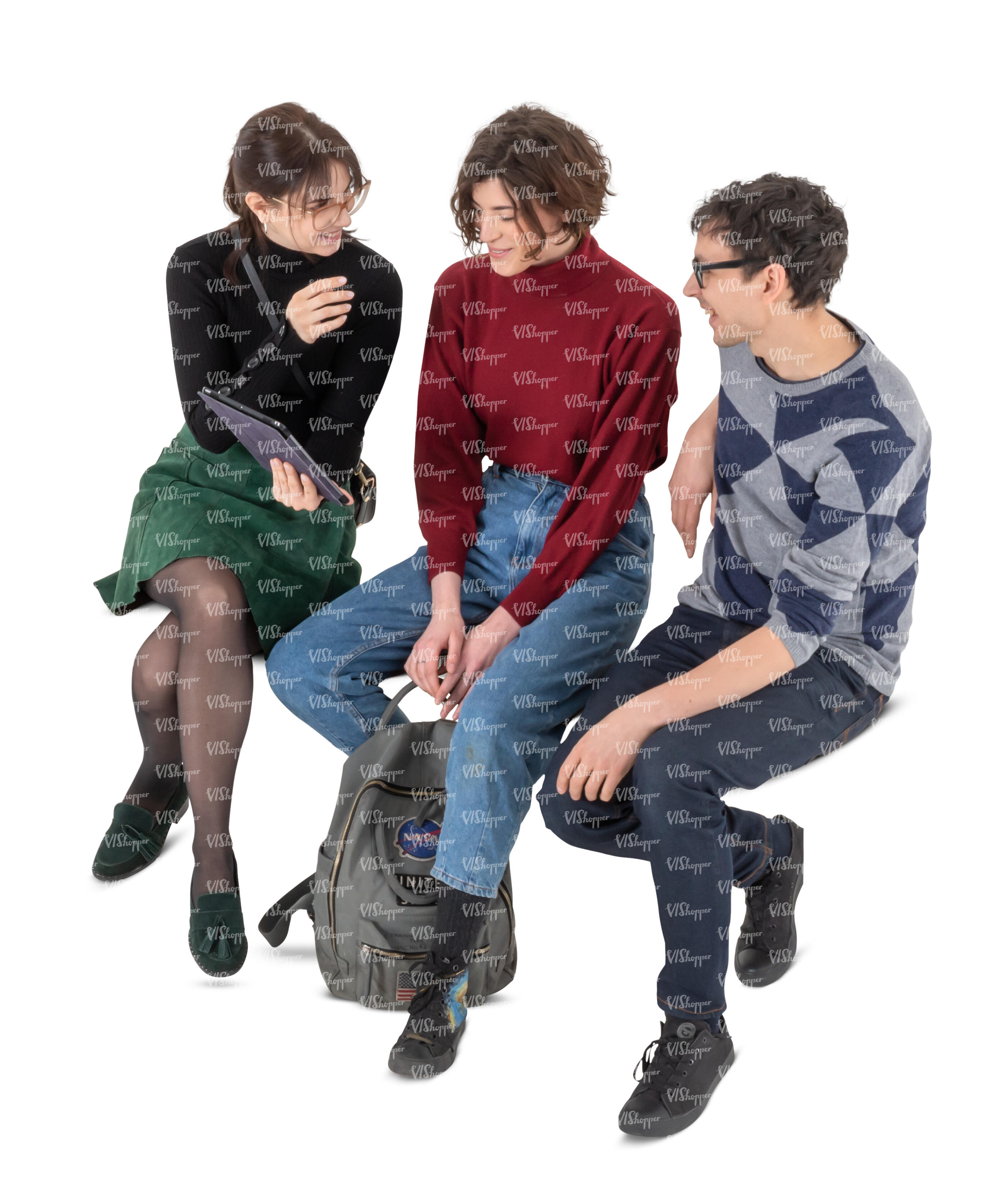 • cut out group of three friends sitting and talking seen from above