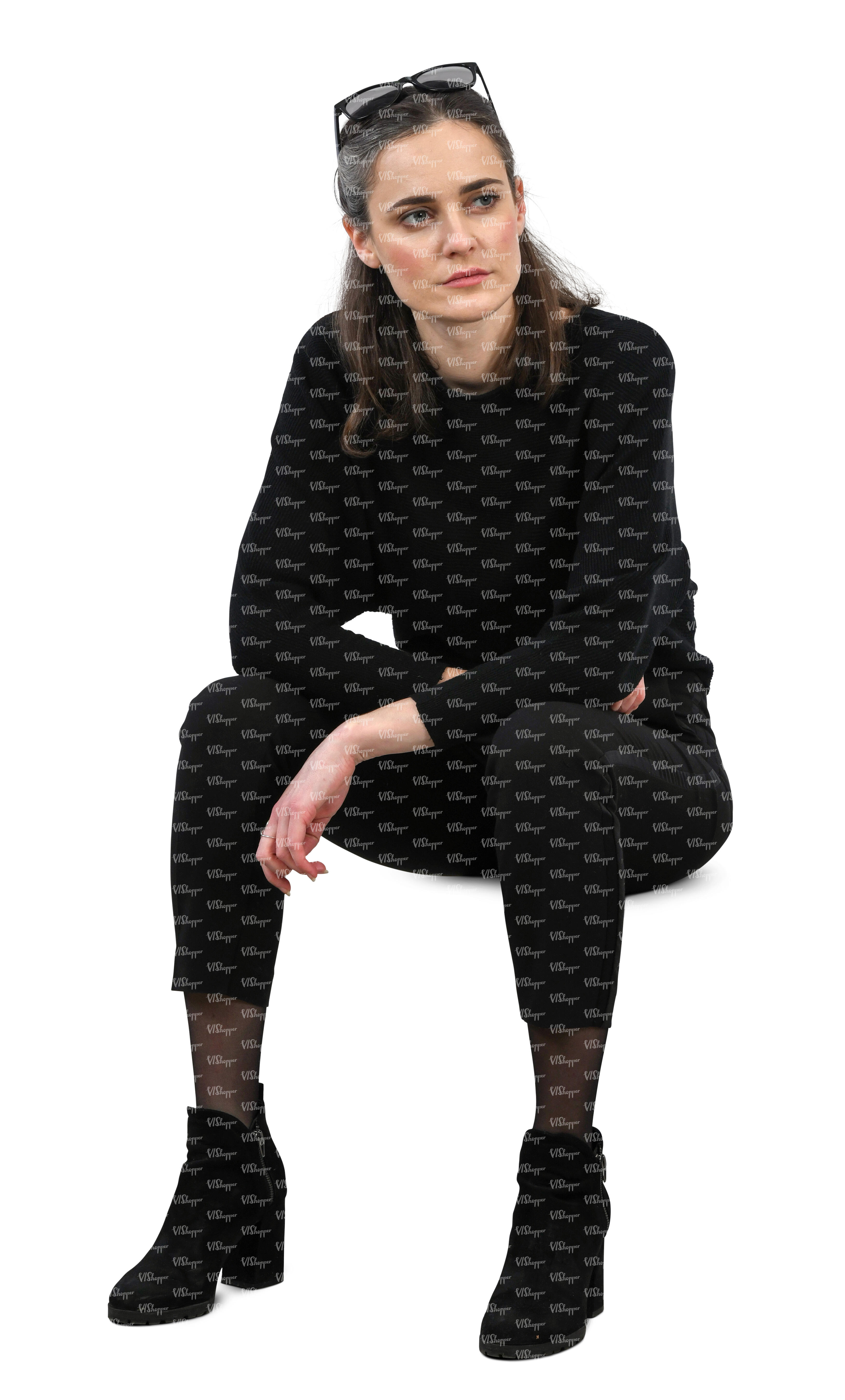 • woman in a black outfit sitting