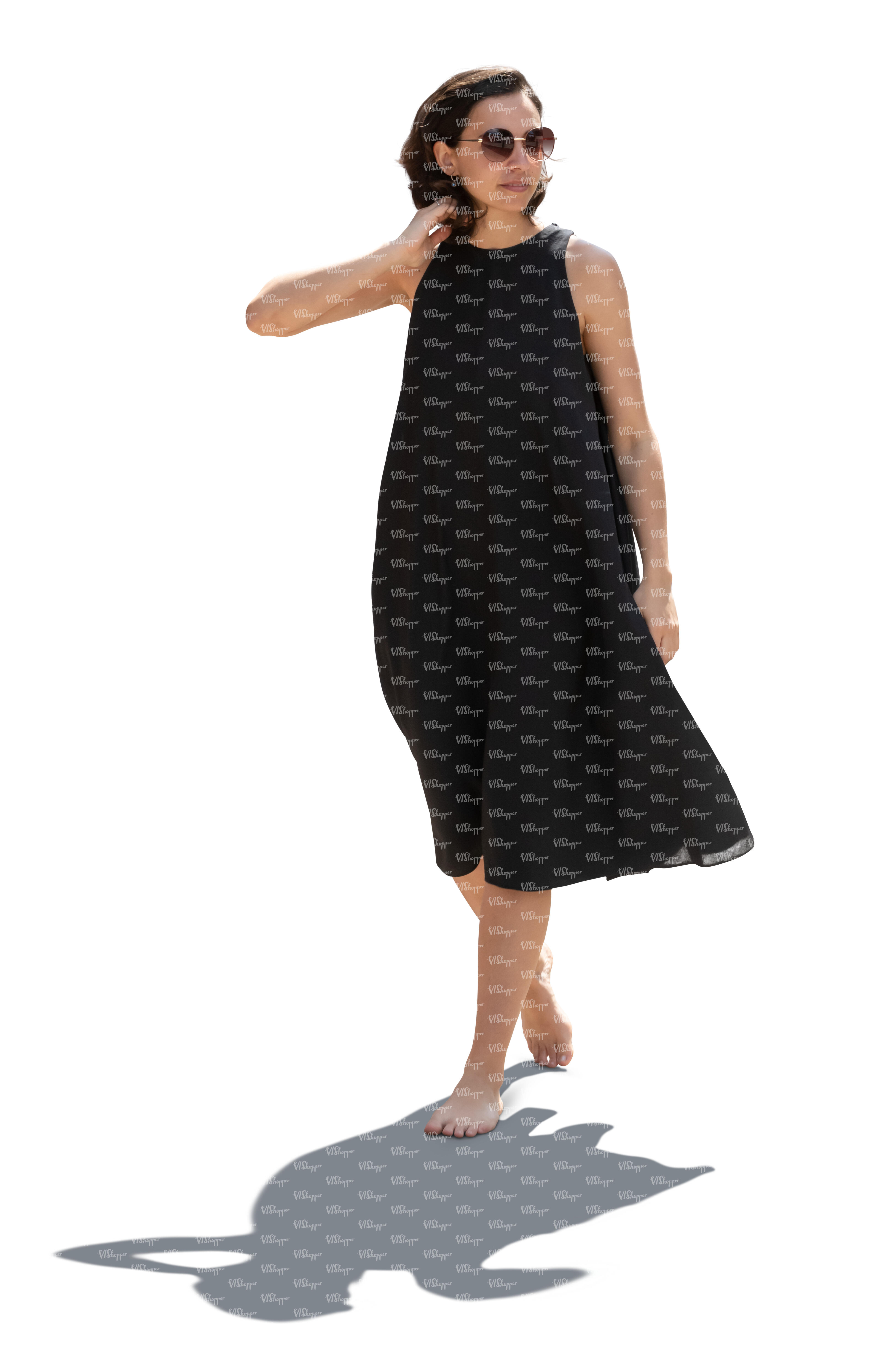 backlit woman in a black dress walking barefoot