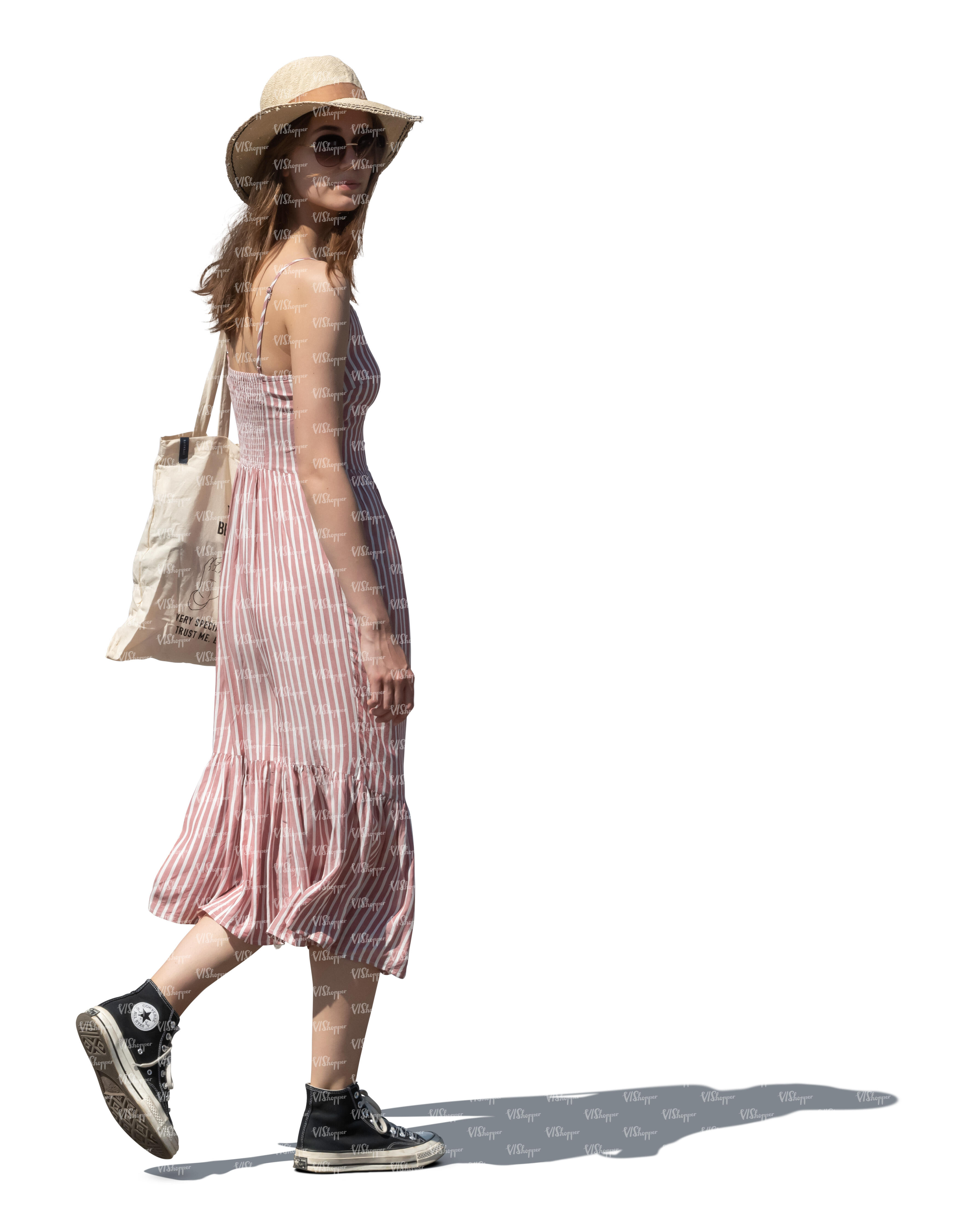 • woman in a summer dress and wearing a hat walking