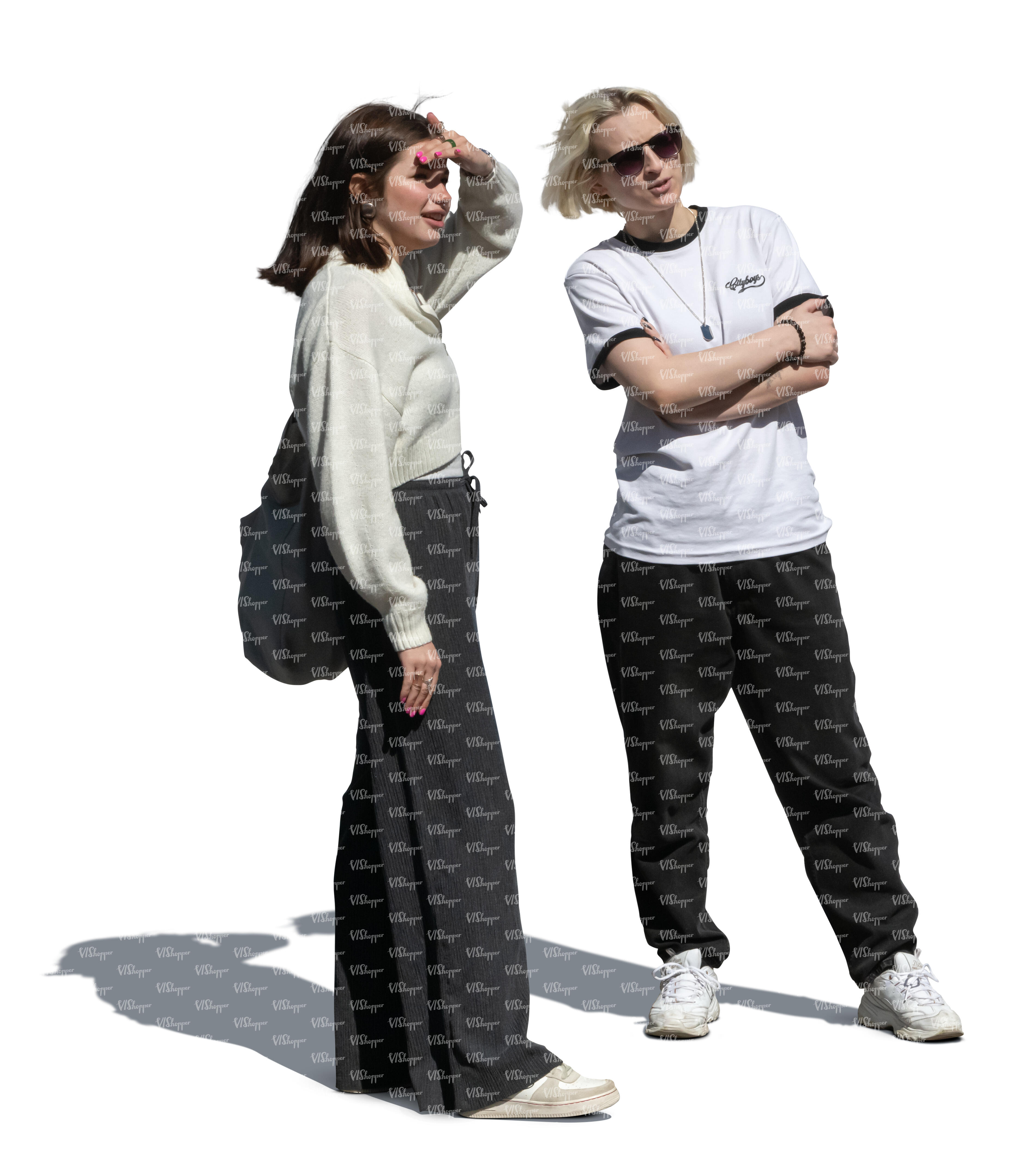 • cut out man and woman standing and talking while drinking refreshing drinks