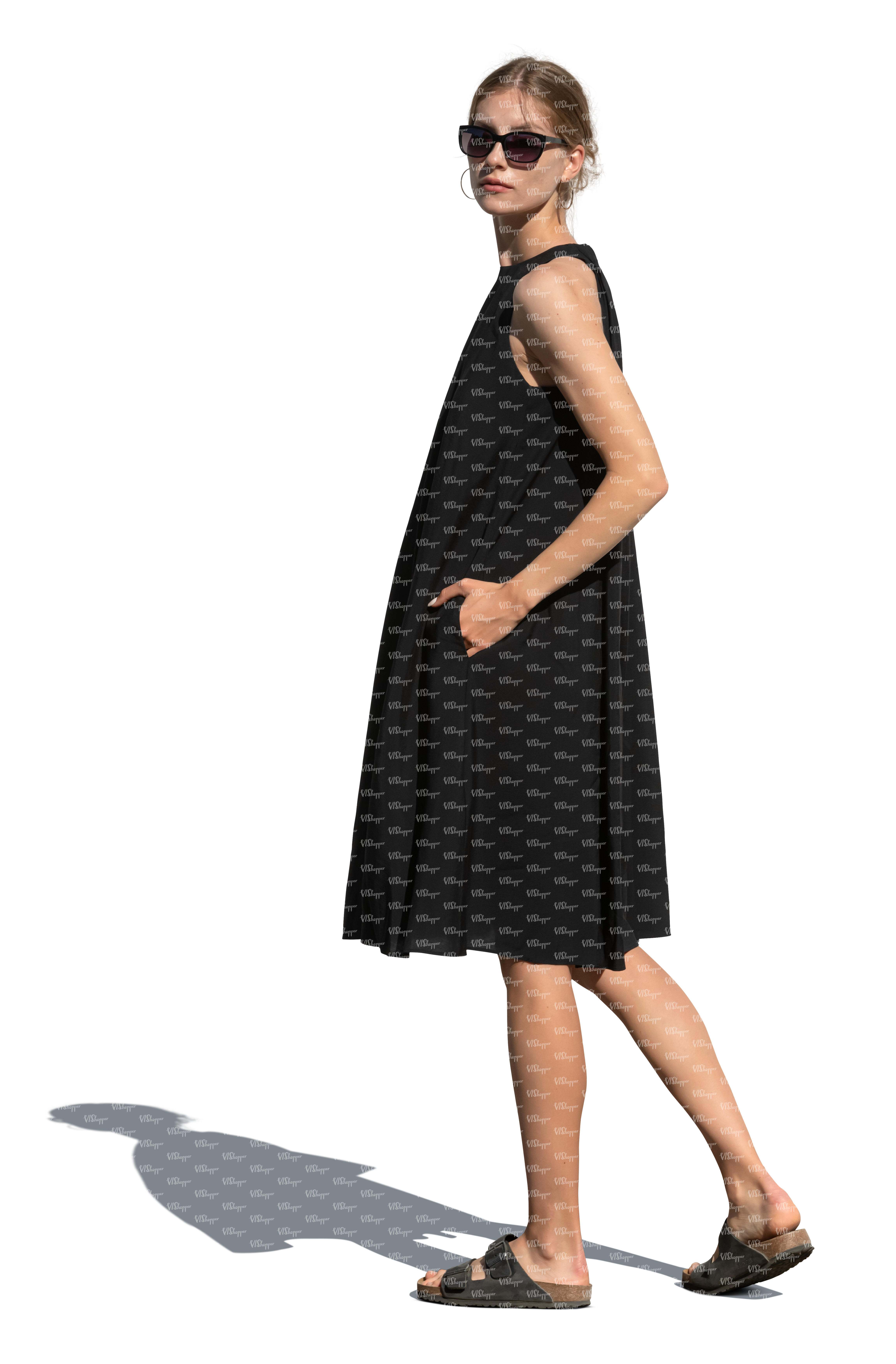 cut out woman in a black dress standing and looking back over the shoulder