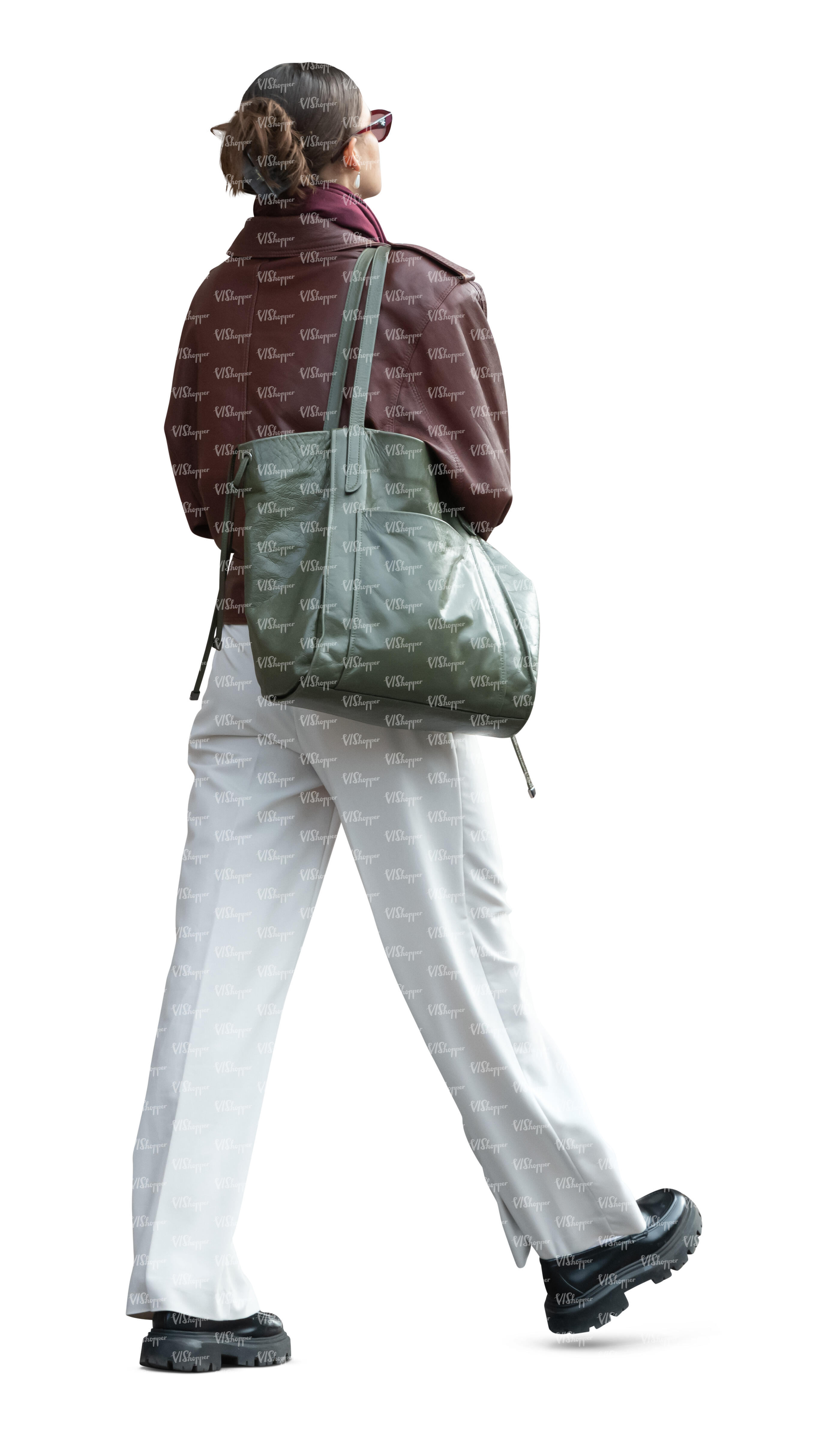 woman in white trousers walking