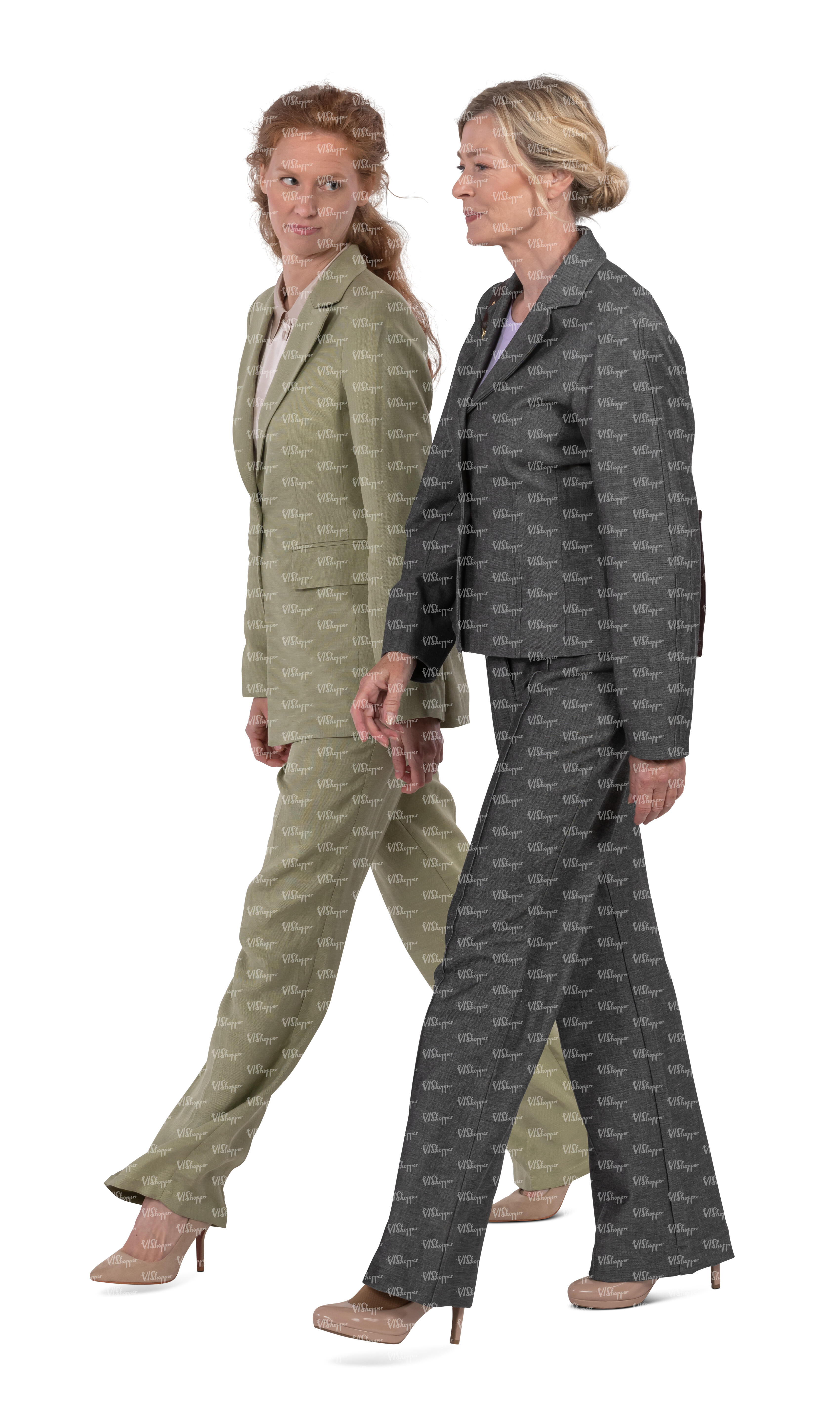 two women wearing business suits walking