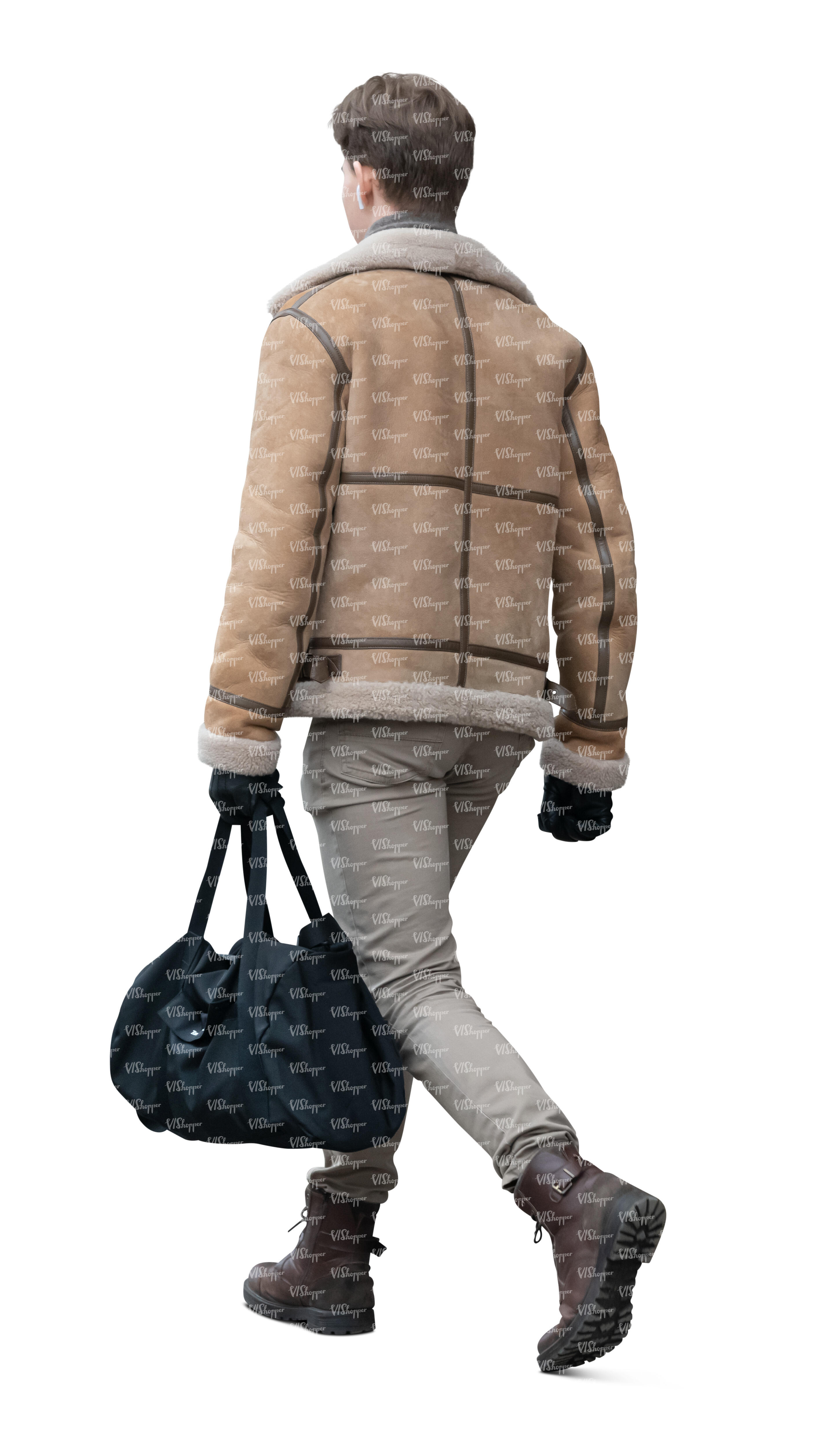 man in a leather jacket and carrying a sports bag walking