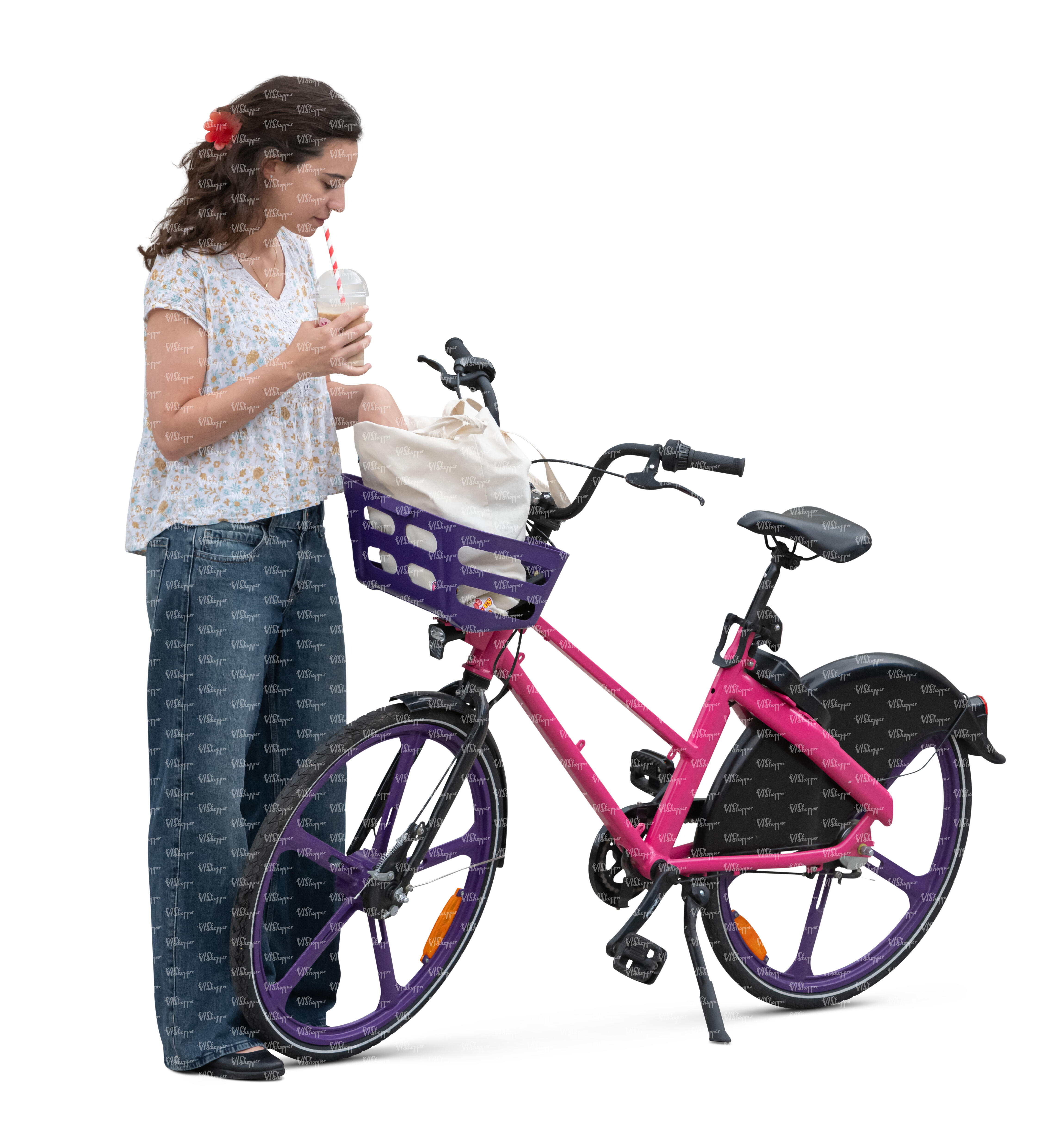 woman with a bike taking smth from the bike basket