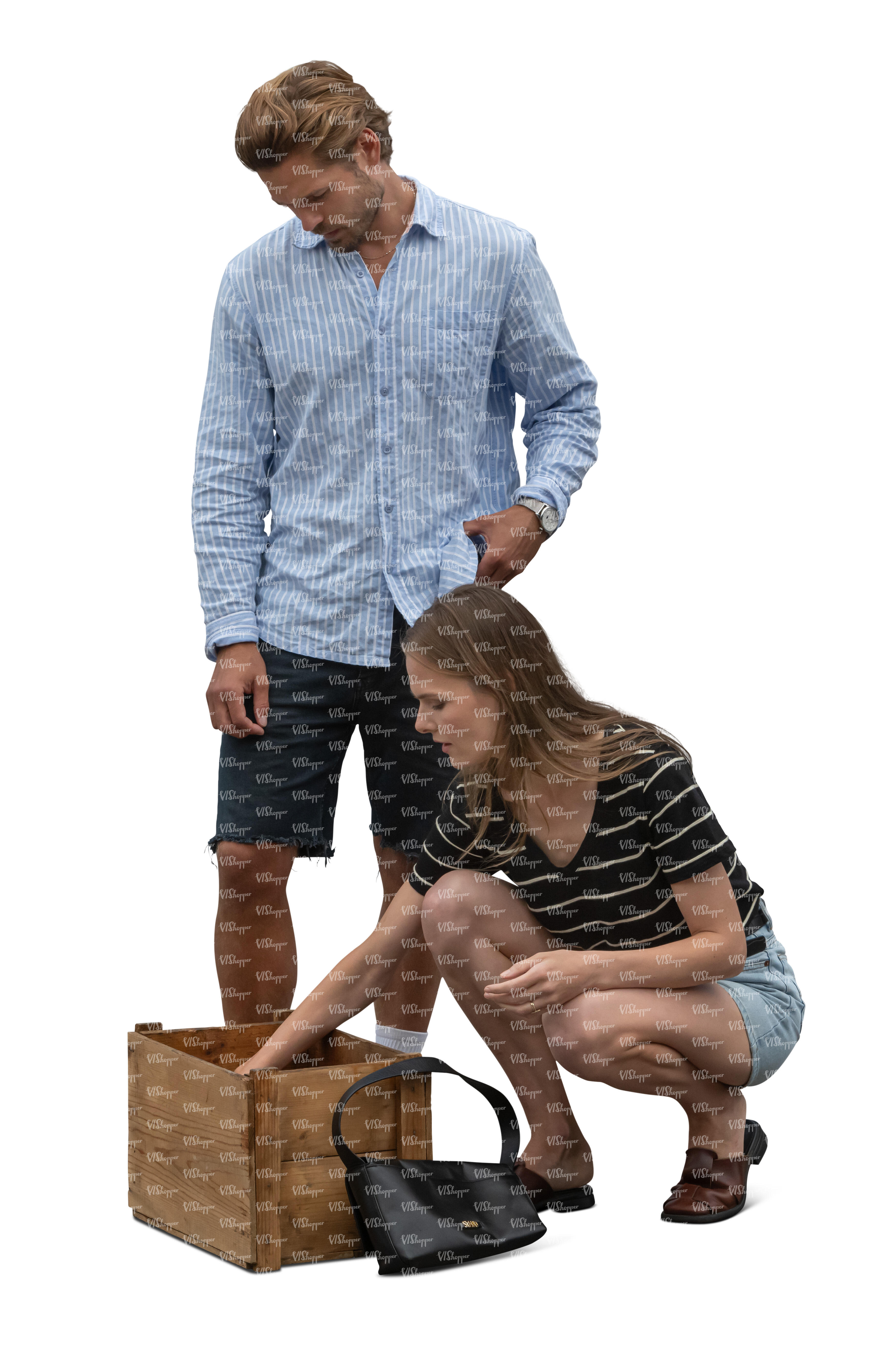 man and woman looking smth from the box on the market