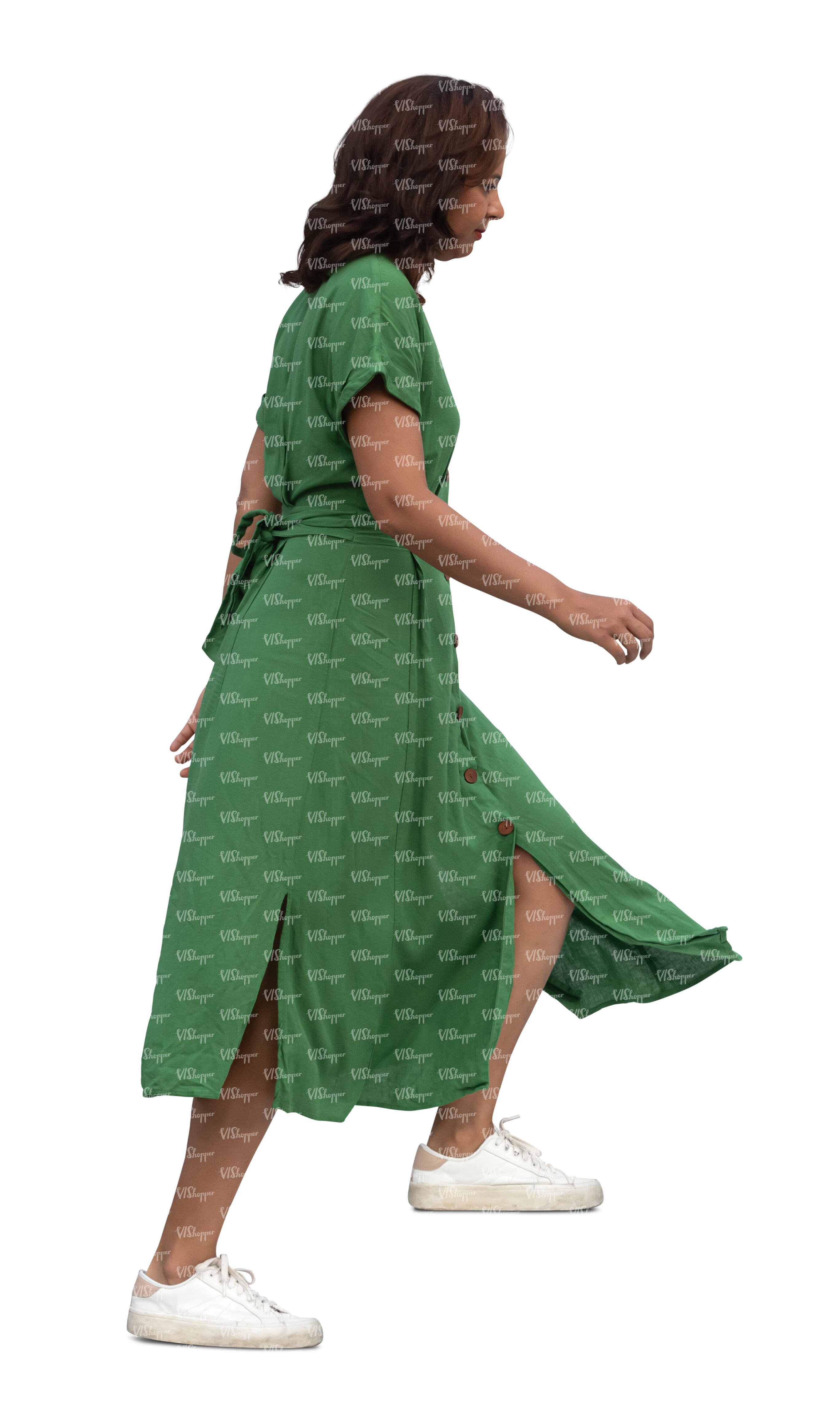 cut out woman in a green dress walking up the stairs