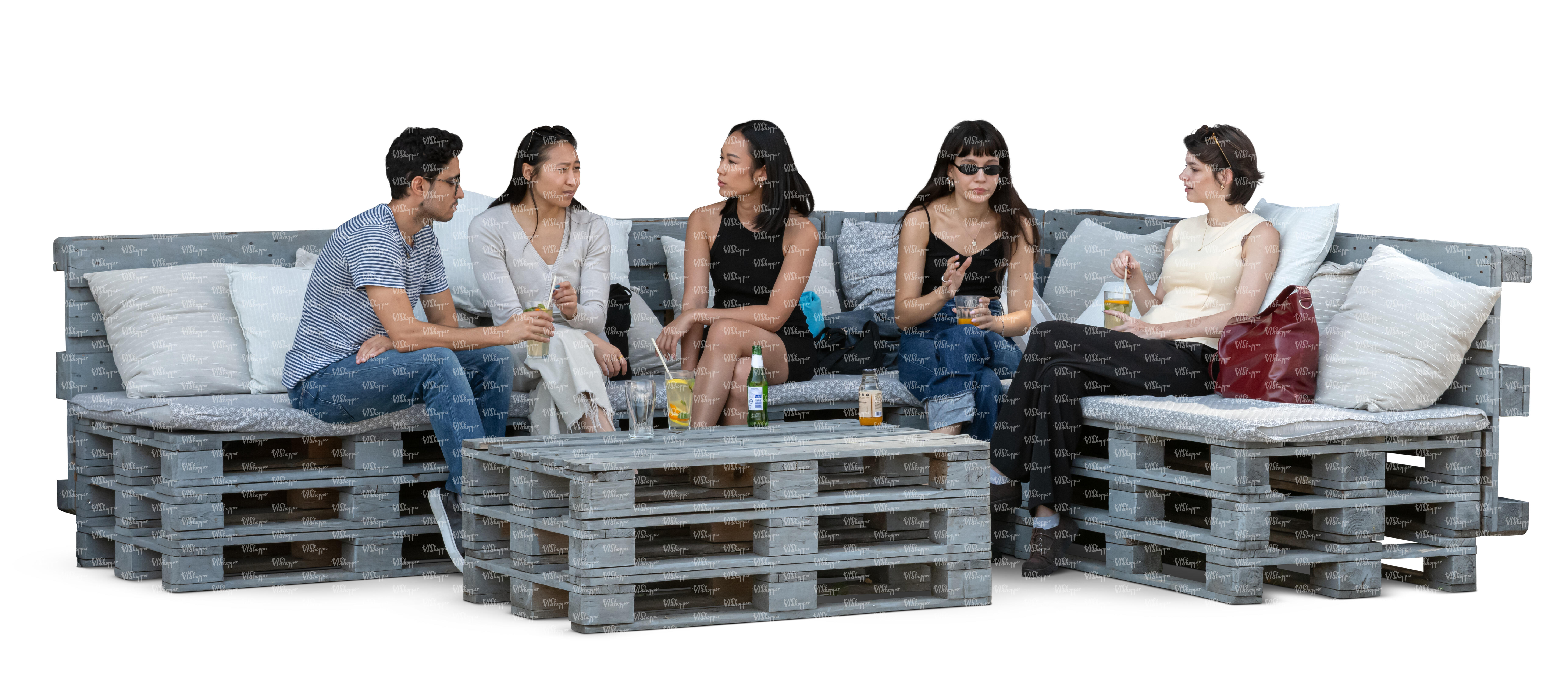 cut out group of people sitting in a hipster cafe with pallet furniture