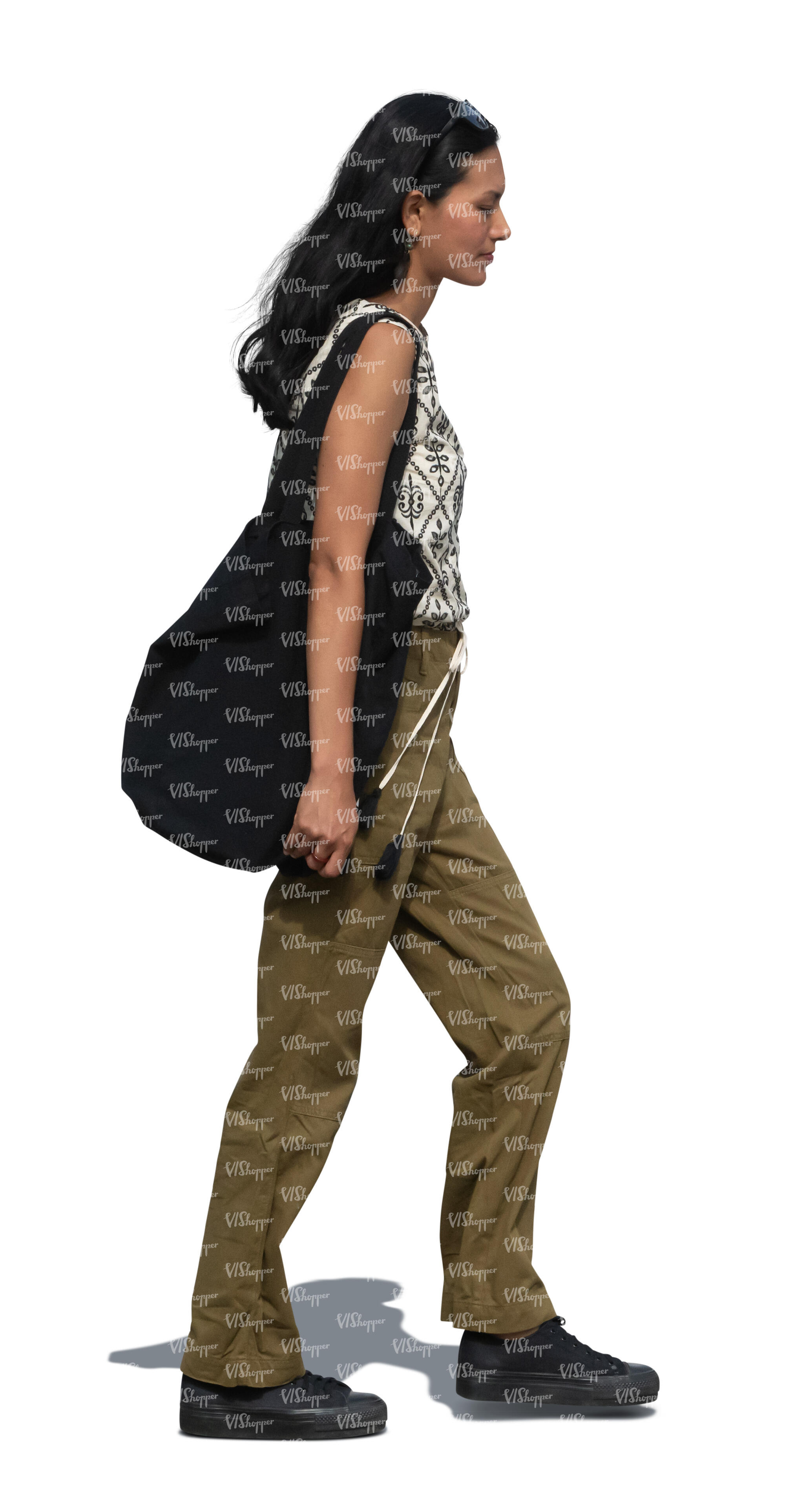 • peruvian woman walking in side view