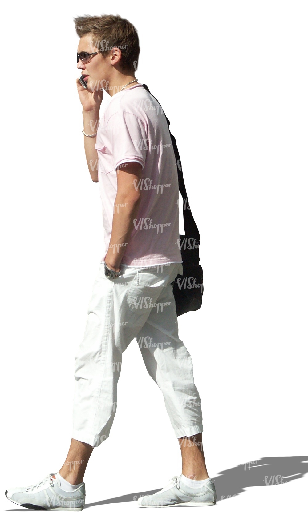 • young man walking and talking on the phone