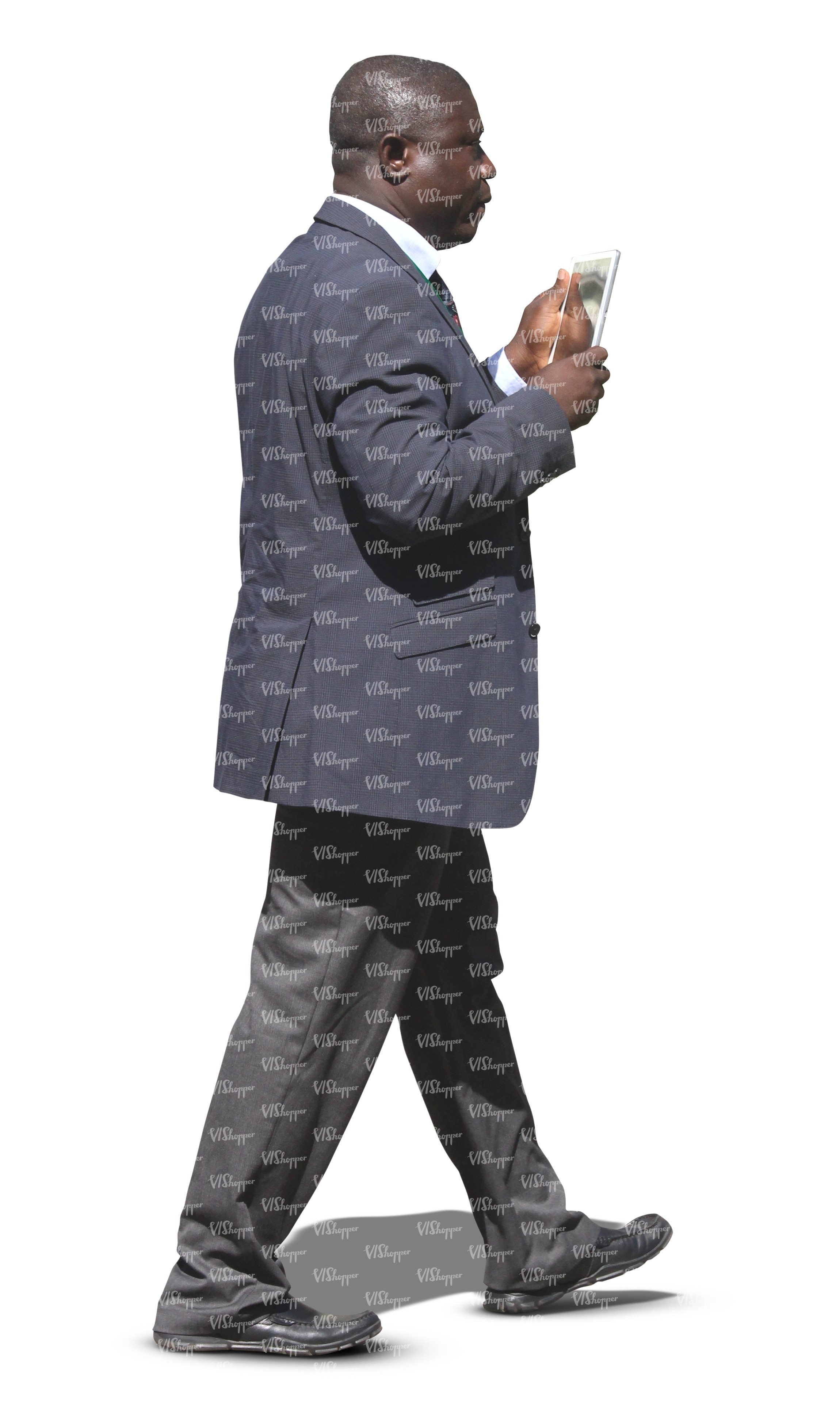 black businessman walking and looking at his tablet