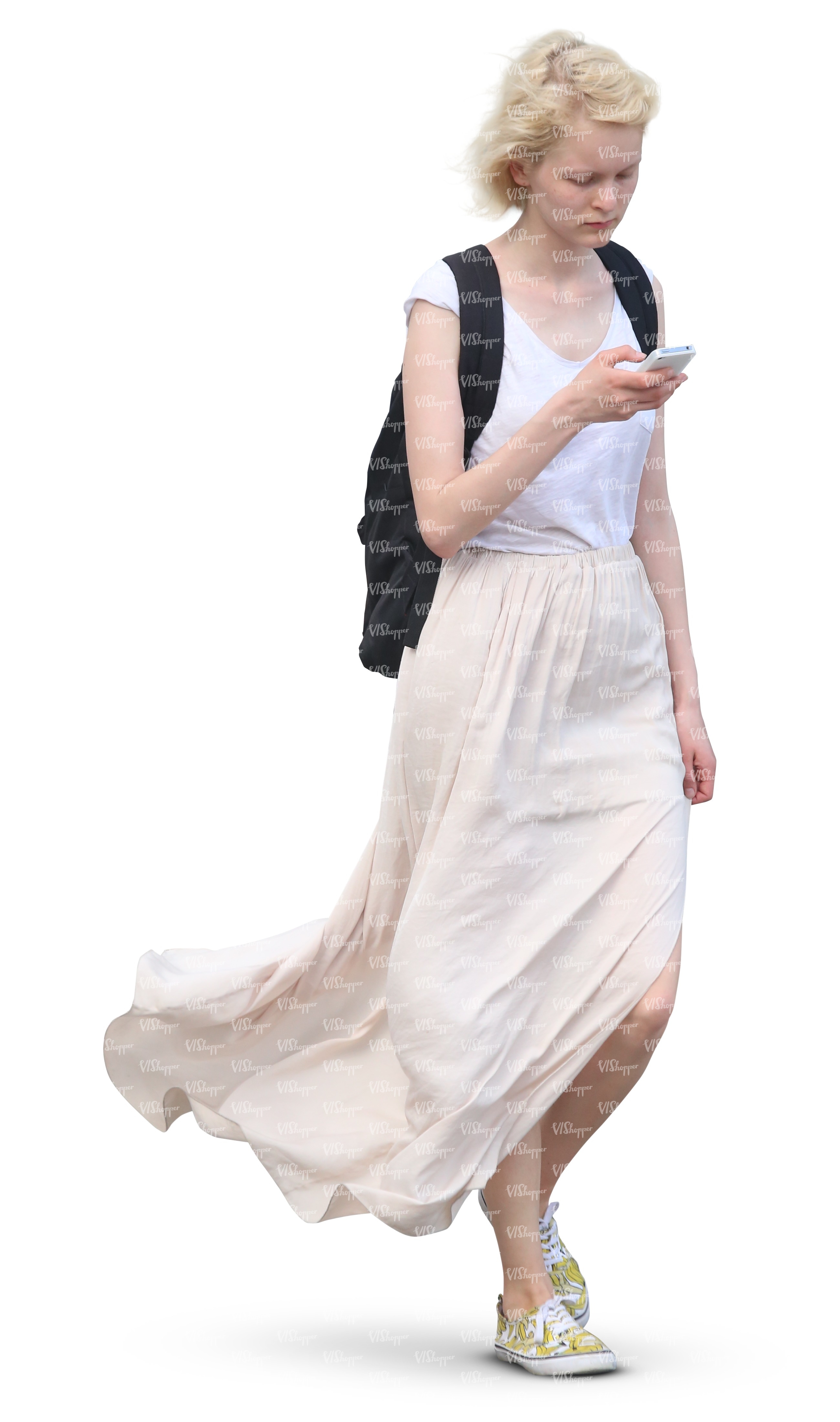 • woman in white outfit walking and looking at her smartphone