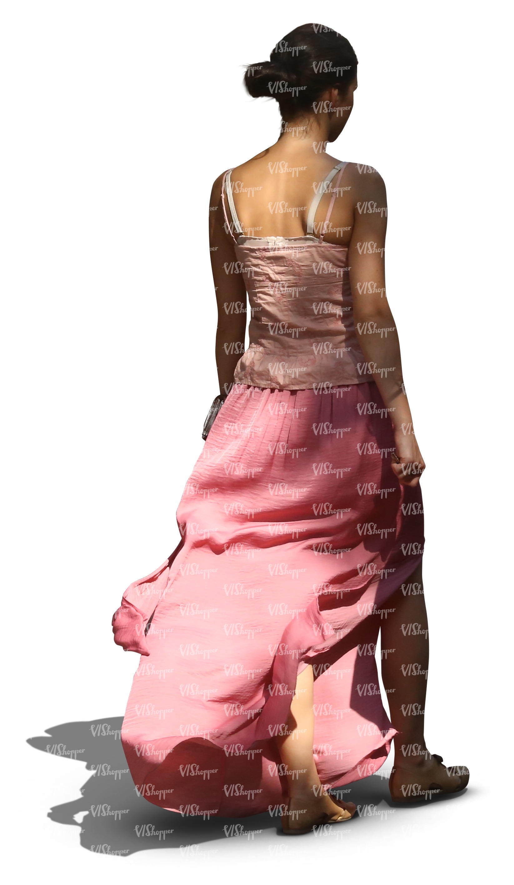 • woman in a long pink skirt walking in tree shade