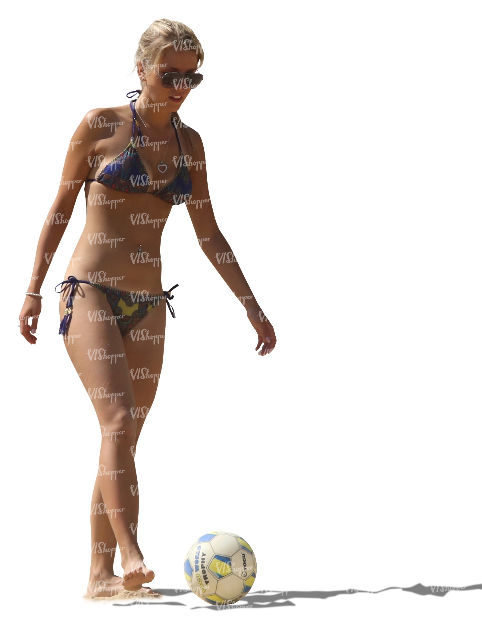 woman in a bikini playing ball on the beach