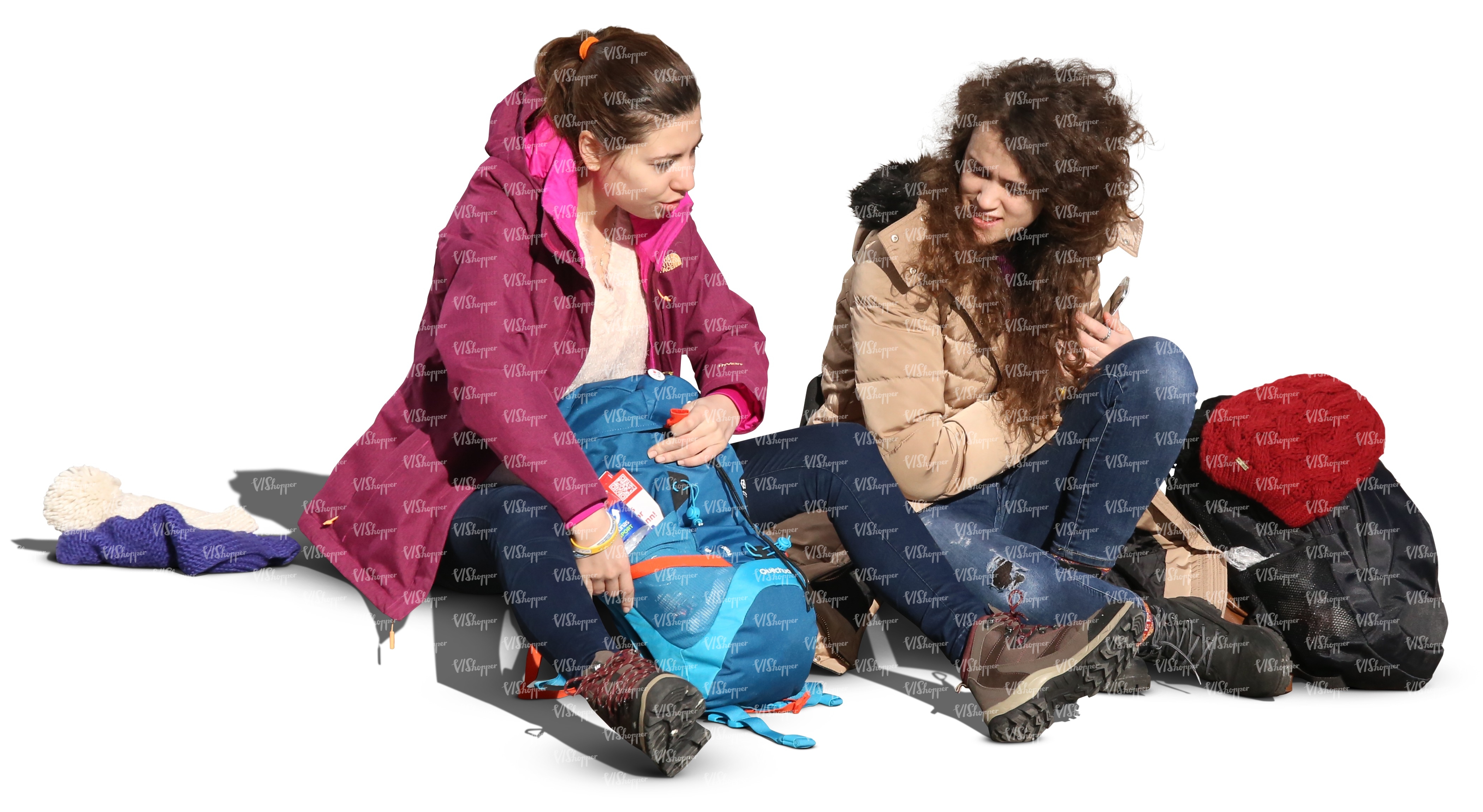 two women sitting on the sidewalk and talking