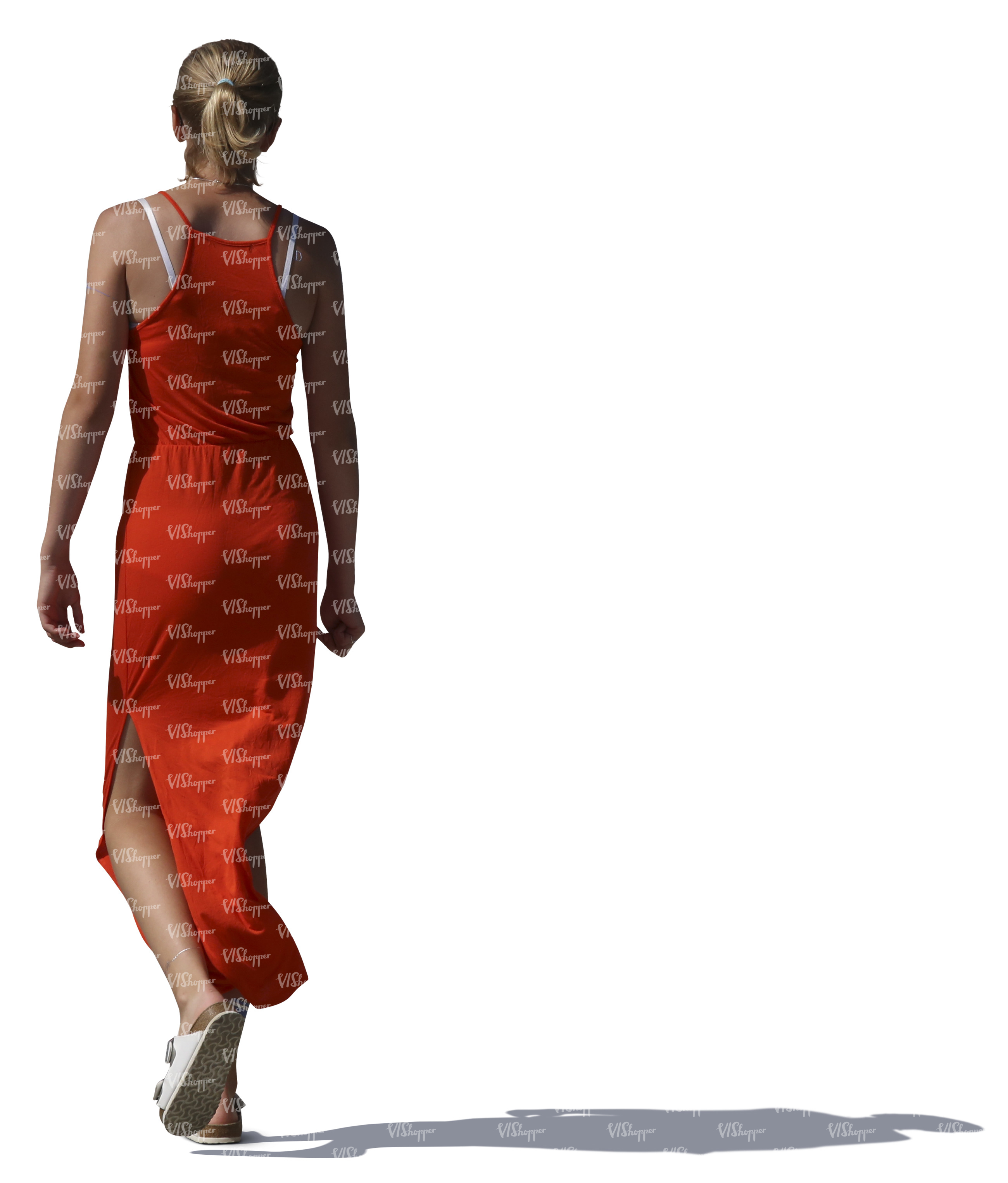 • woman in a long red dress walking