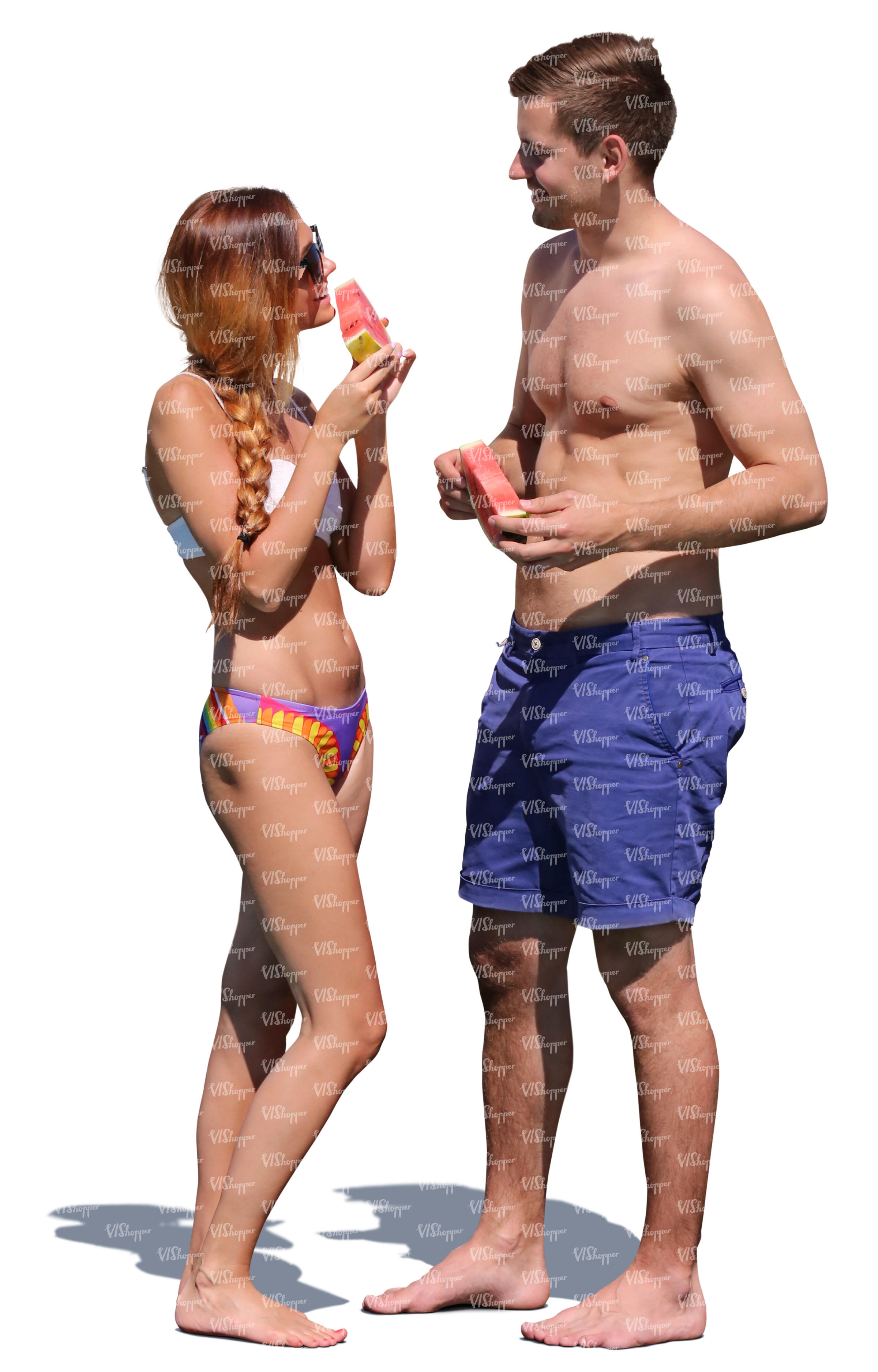 couple standing on the beach and eating watermelon