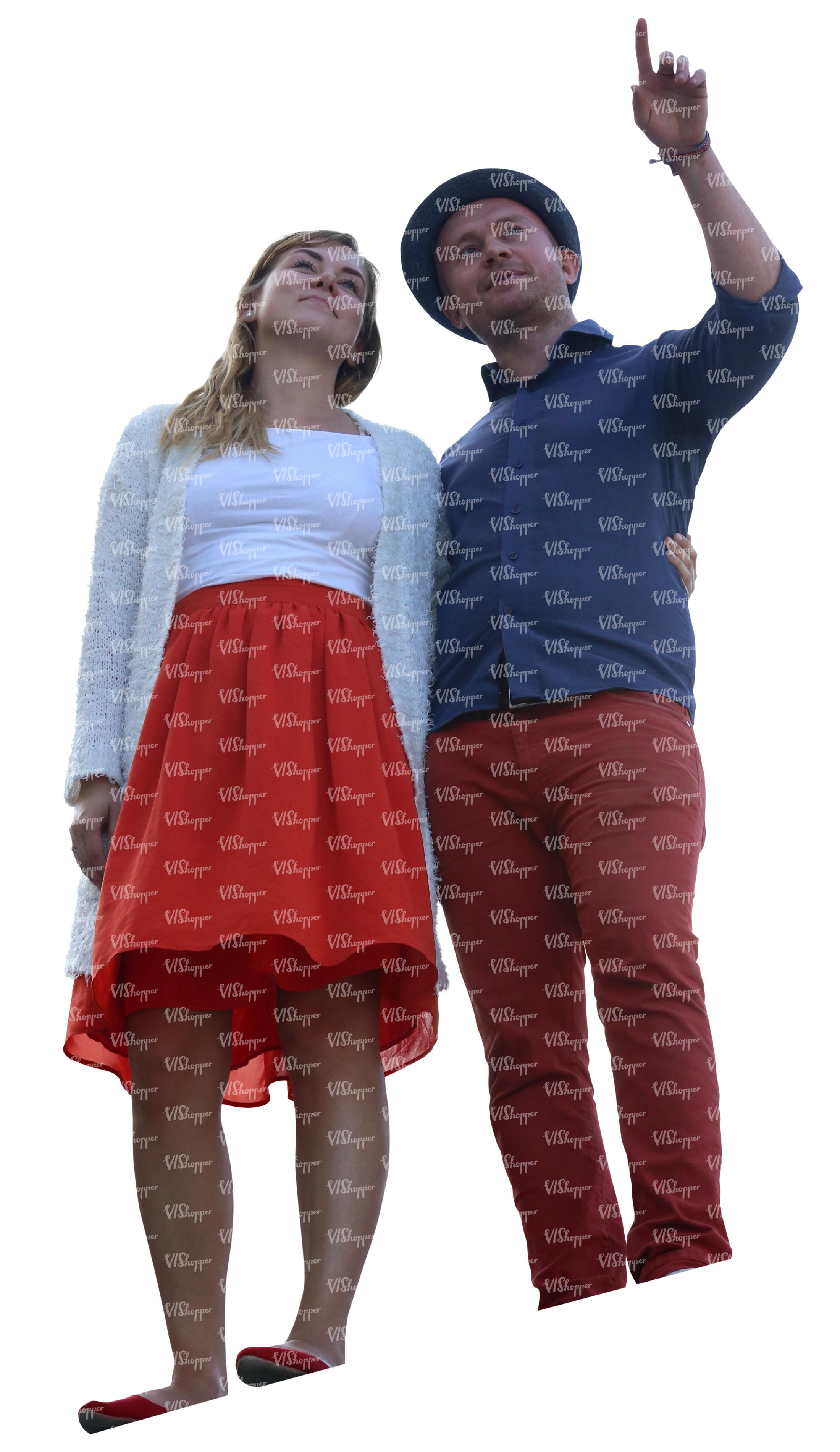 • cut out man and woman standing and talking while drinking refreshing drinks