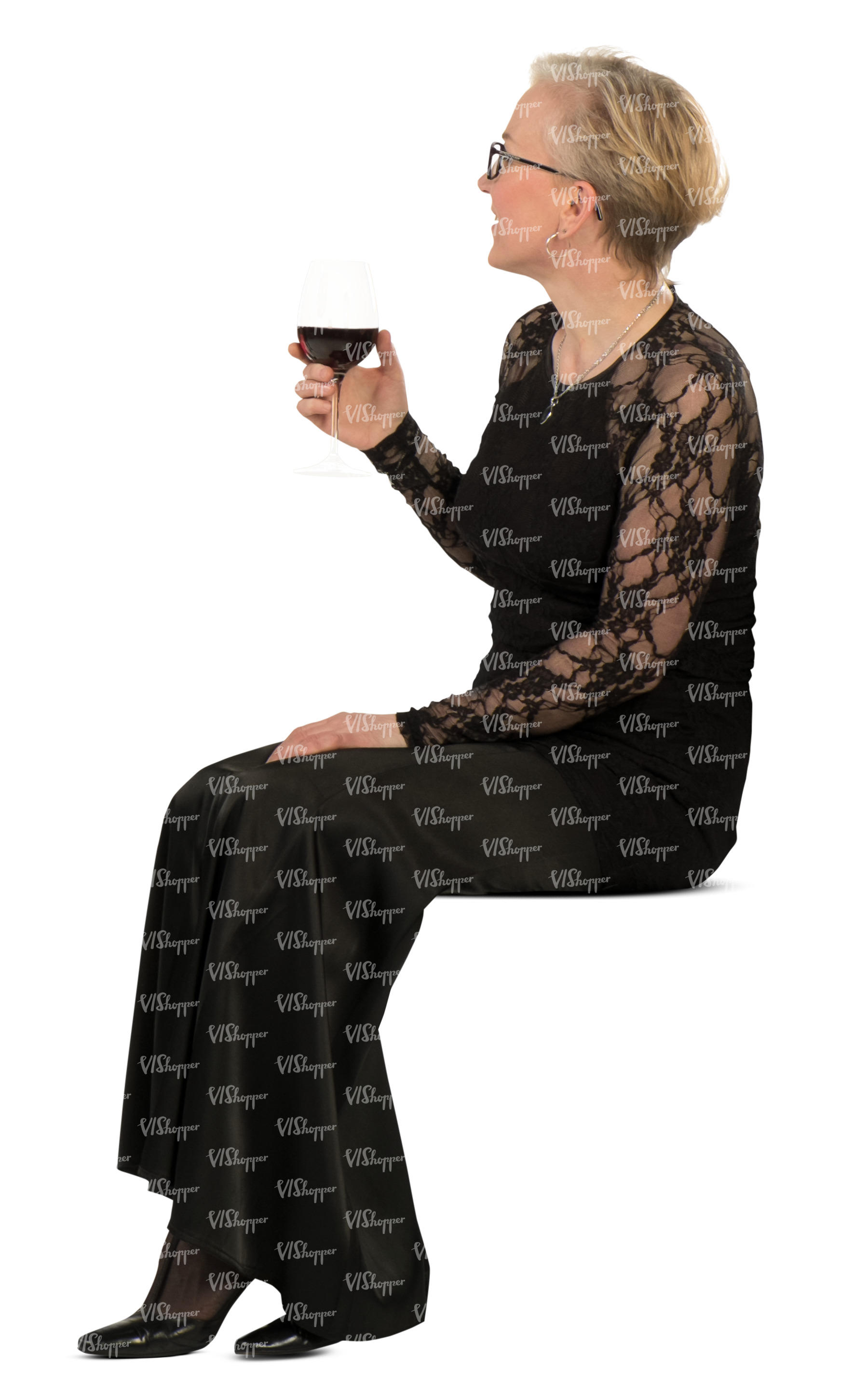 • woman in a formal black dress sitting and drinking wine
