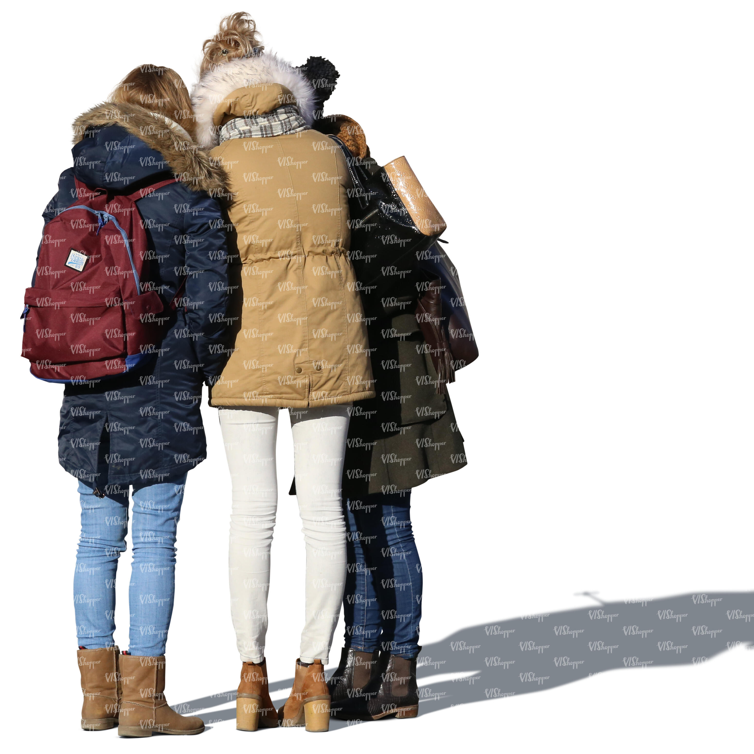 • three girls in overcoats standing in a group