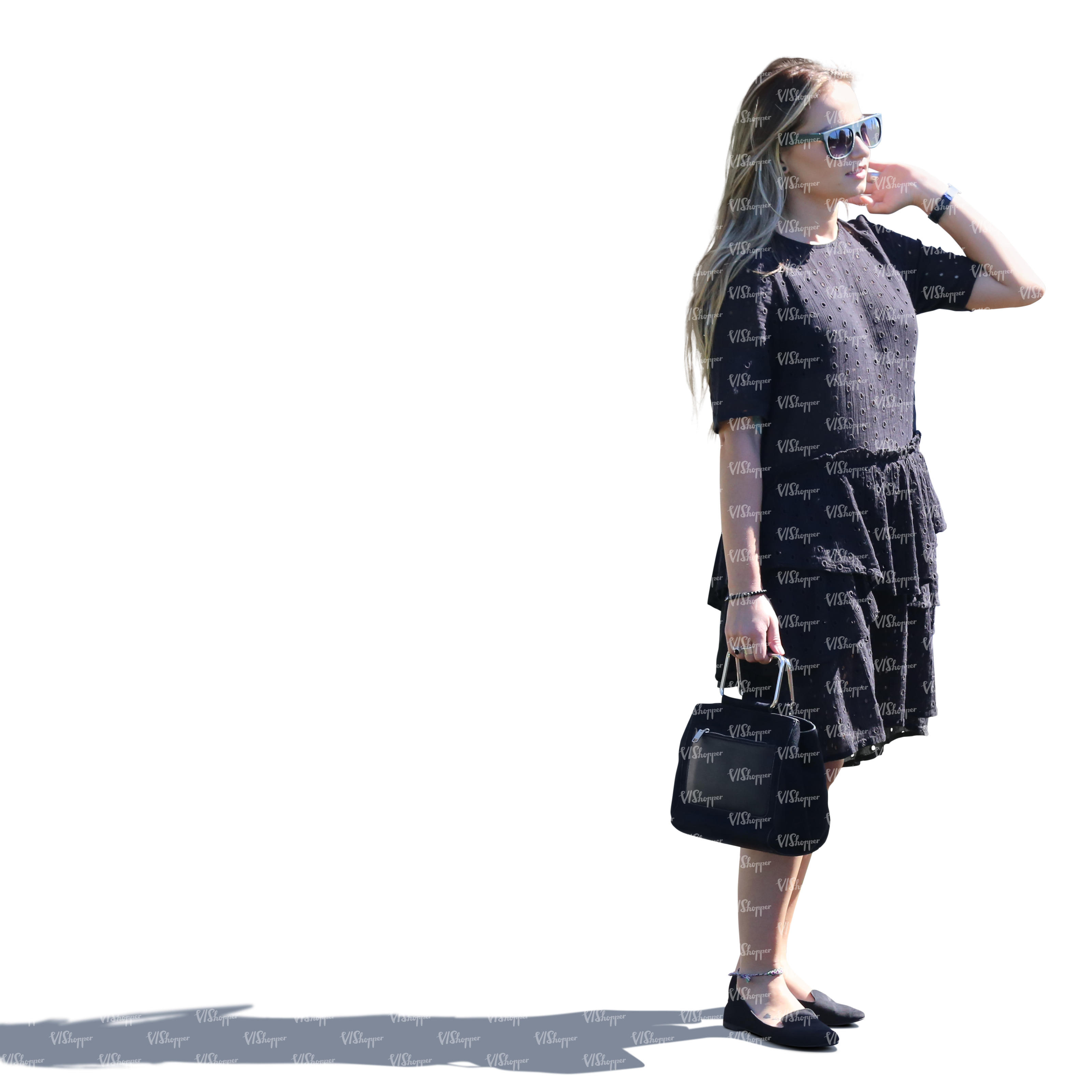 • sidelit woman in a black summerdress standing
